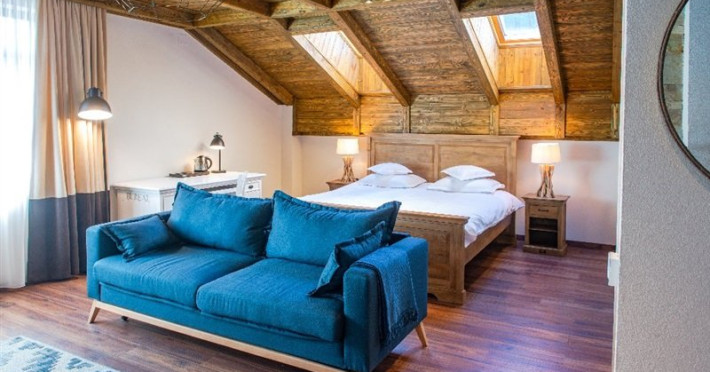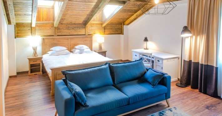 Camera dubla premium: Camera cu suprafata de 40 mp, cu balcon, pentru doi adulti si un copil, cu un pat dublu mare si o canapea extensibila.