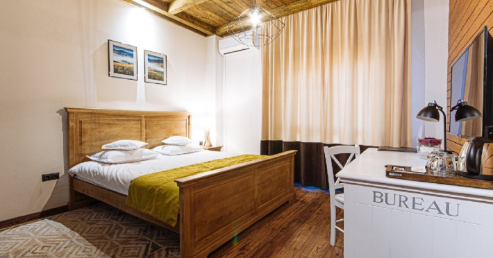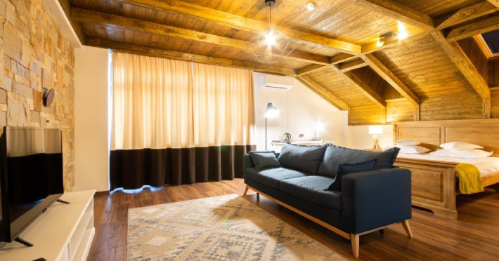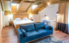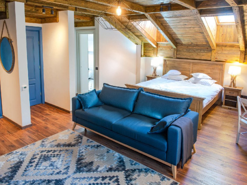 Camera dubla Superior - cu un design primitor, are o scara interioara, la primul nivel fiind baia si o canapea extensibila, iar la mansarda dormitorul cu un pat king bed. Suprafata de 35 mp, cu balcon.