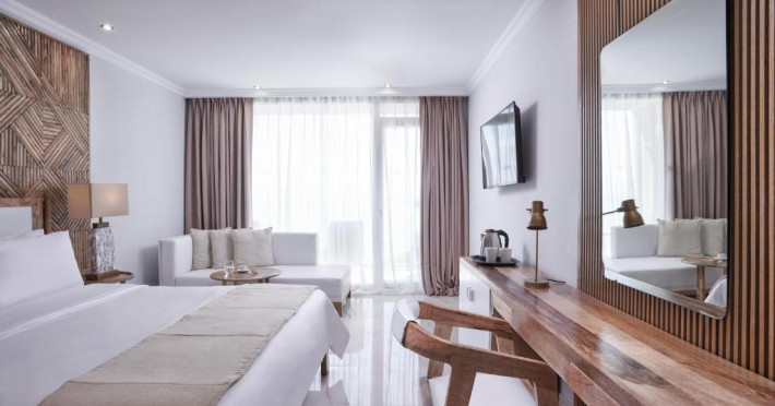 Camerele hotelului au aer condiționat, zonă de relaxare, TV cu ecran plat cu canale prin satelit, seif și baie privată cu duș, uscător de păr și articole de toaletă gratuite. Kairaba Mythos Palace - Adults Only oferă anumite camere cu vedere la mare, iar camerele au balcon. In toate camerele de la cazare se asigură lenjerie de pat și prosoape.