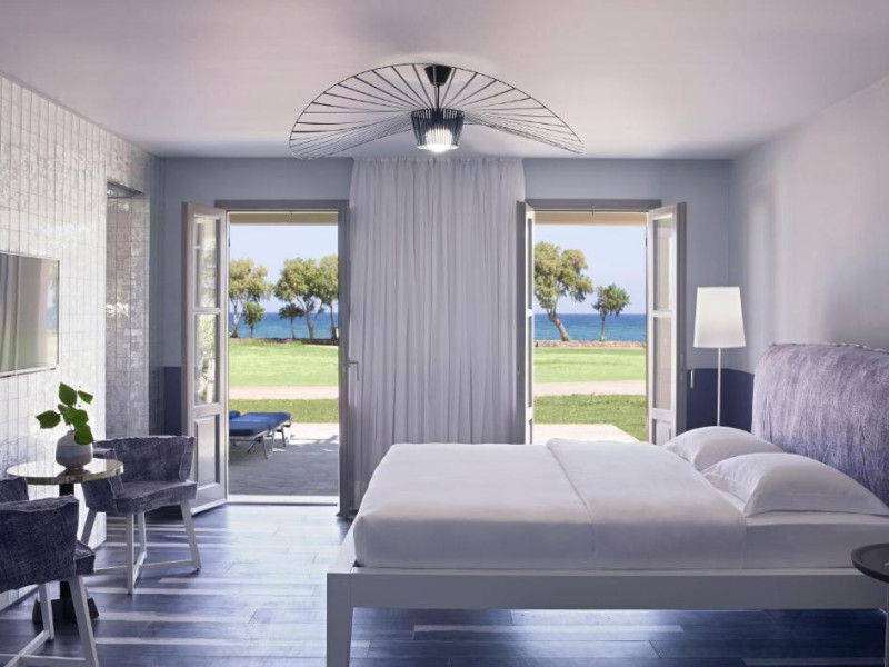 Restaurantul principal are vedere la mare și servește preparate mediteraneene și internaționale. Oaspetii pot savura băuturi, cocktailuri si inghetată intr-unul din barurile complexului, printre care se numără un bar amplasat pe plajă si o cafenea grecească traditională.