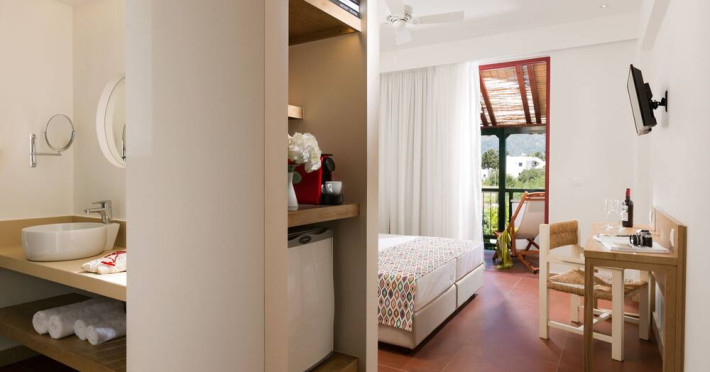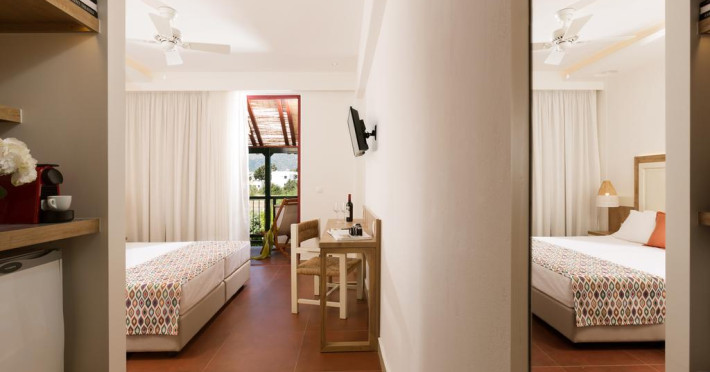 Sunt disponibile 43 camere. Camerele de la Kalypso Hotel au în dotare aer condiționat și Tv. Oaspeții au la dispoziție serviciul de room service pentru a servi masa sau diverse băuturi. Oaspeții au acces gratuit la serviciul Wi-fi în camere. Camerele au balcon cu vedere la piscină sau la grădină. În camere există baie cu cadă sau duș prevăzută cu foehn. Curățenia in cameră se face zilnic. Proprietatea oferă camere pentru nefumători.