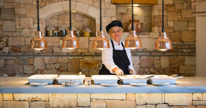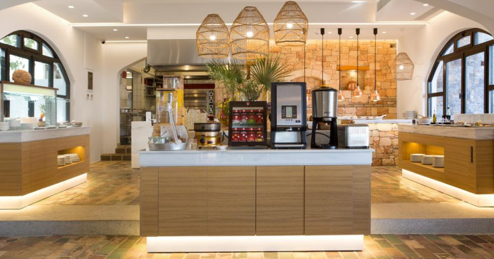 La Kalypso Hotel oaspeții au la dispoziție un restaurant care servește mâncare în stil bufet. Preparate din bucătăria grecească așteaptă să fie degustate în fiecare zi. Masa poate fi servită atât în interior, cît si în aer liber, pe terasă, în funcție de vreme. În cadrul proprietății există și un snack bar care servește băuturi și gustări.