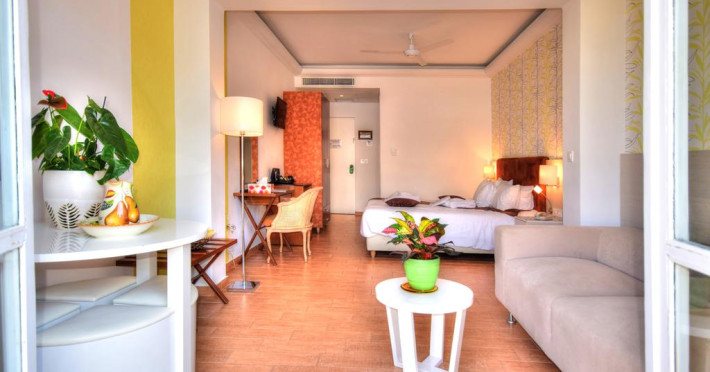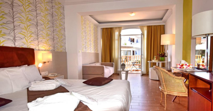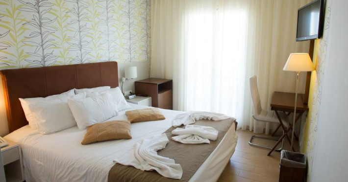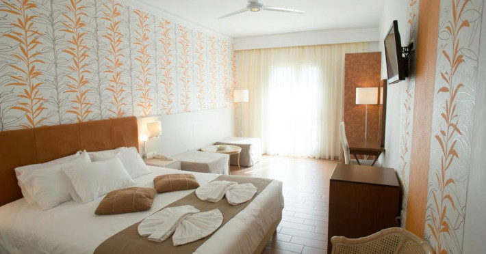 Sunt disponibile 100 camere. Camerele confortabile de la Kalyves Beach au pardoseală de gresie/ marmură, aer condiționat, Tv cu canale prin satelit și seif. Fiecare cameră dispune de cană pentru prepararea apei calde. Oaspeții pot solicita serviciul de room service pentru a servi masa sau diverse băuturi. Unele camere au balcon cu vedere la mare sau la grădină. În camere există baie cu cadă sau duș prevăzută cu foehn. Oaspeții au acces gratuit la serviciul Wi-fi în camere. Curățenia in cameră se face zilnic. Toate camerele spațioase de la Kalyves Beach au zonă de relaxare. Proprietatea oferă camere pentru familie cu o suprafață mai mare și un număr mai mare de paturi față de cele standard. Se pot rezerva de asemenea camere pentru nefumători.