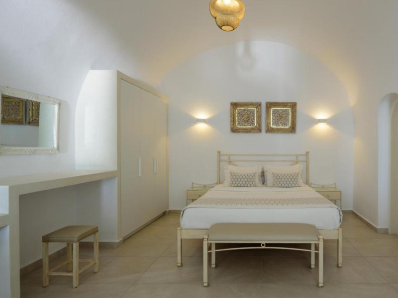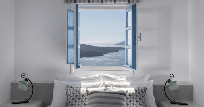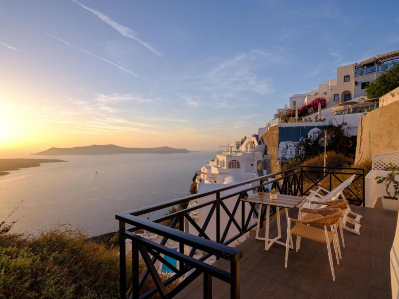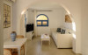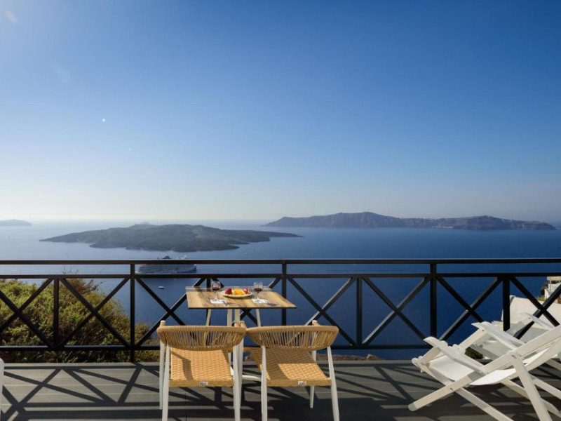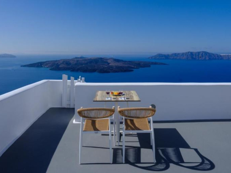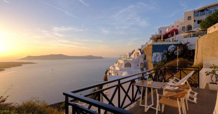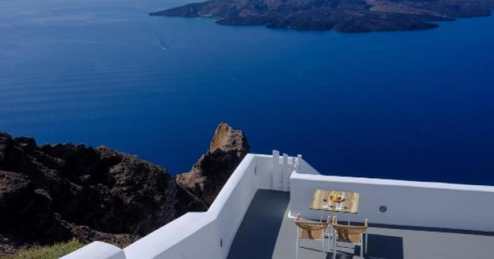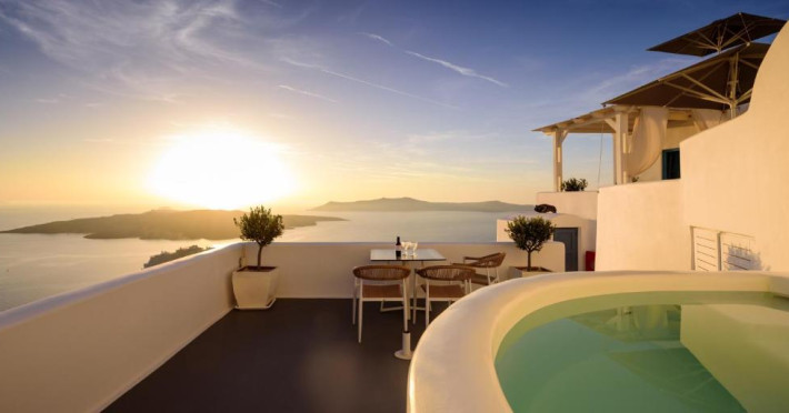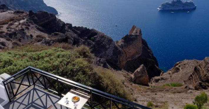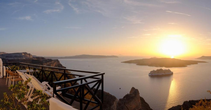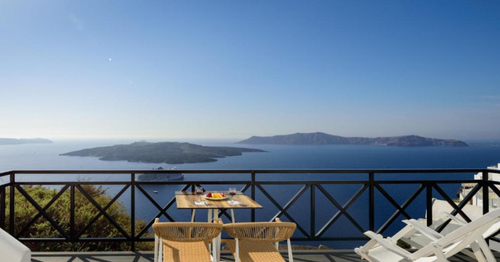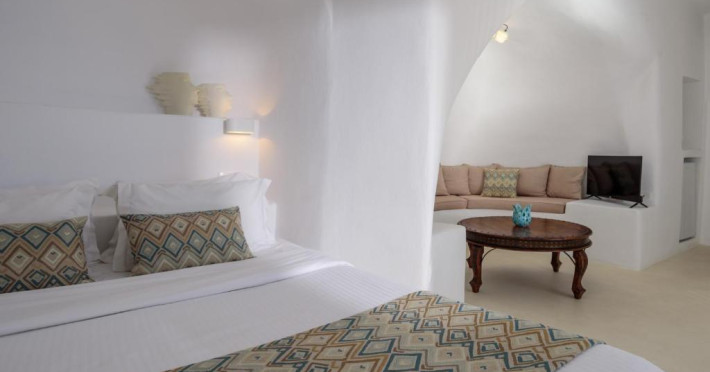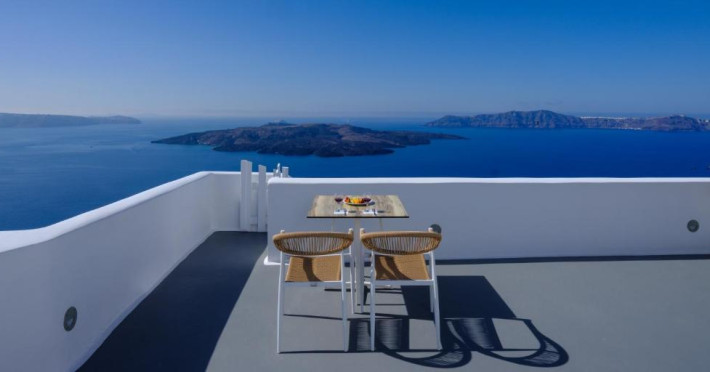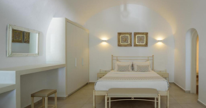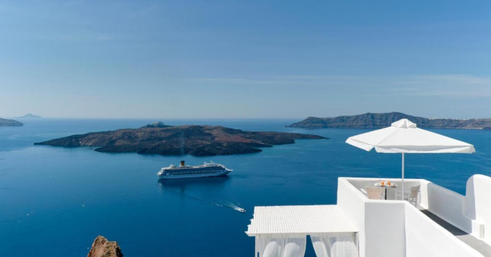Proprietatea in stil cicladic Kamares Apartments oferă apartamente elegante cu vedere la caldeiră, la vulcan și la apusul de soare. Se află pe faleza impresionantă a orasului Fira de pe insula Santorini.