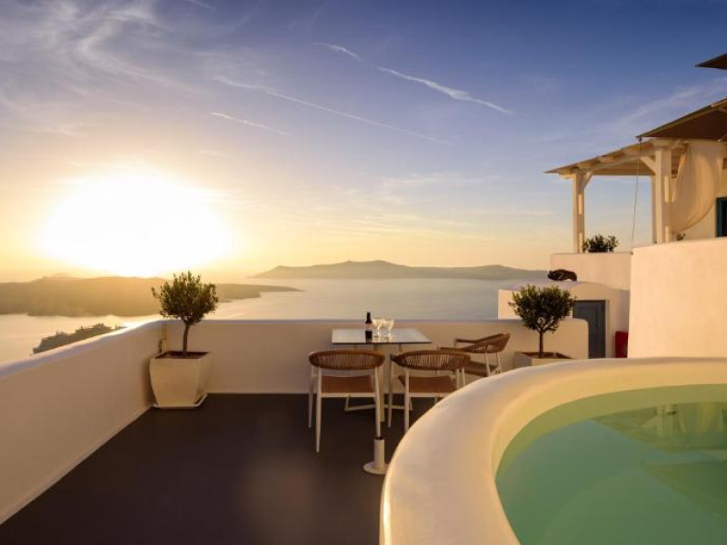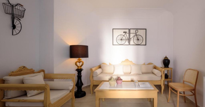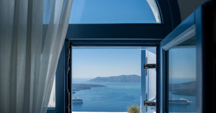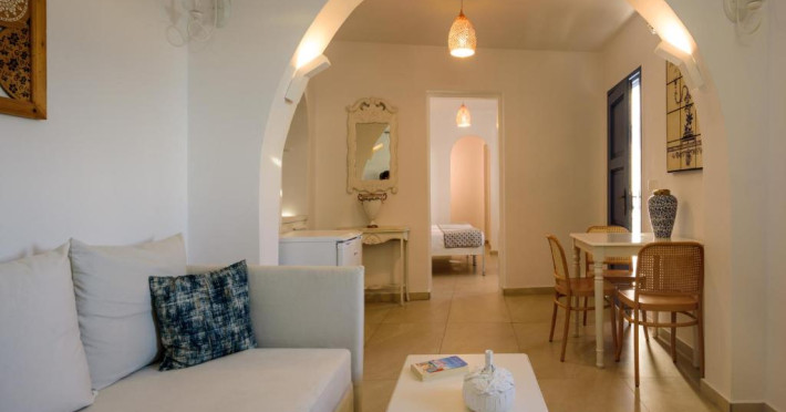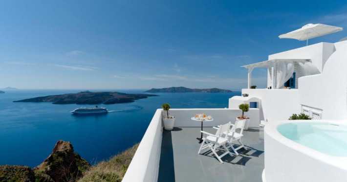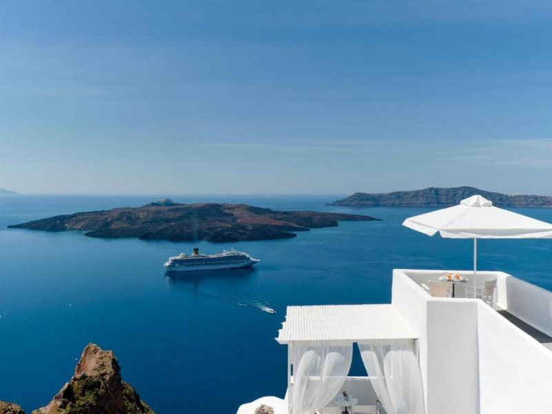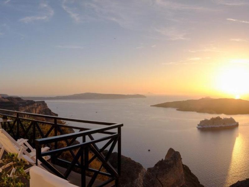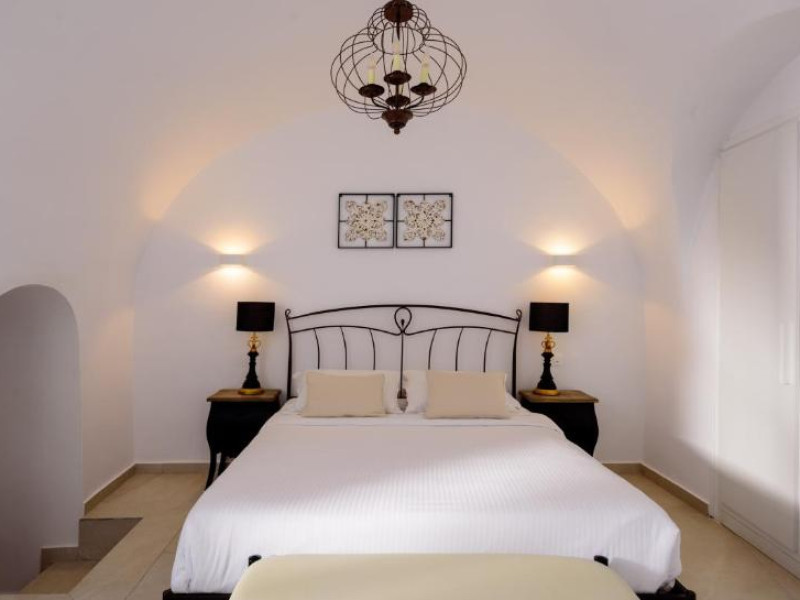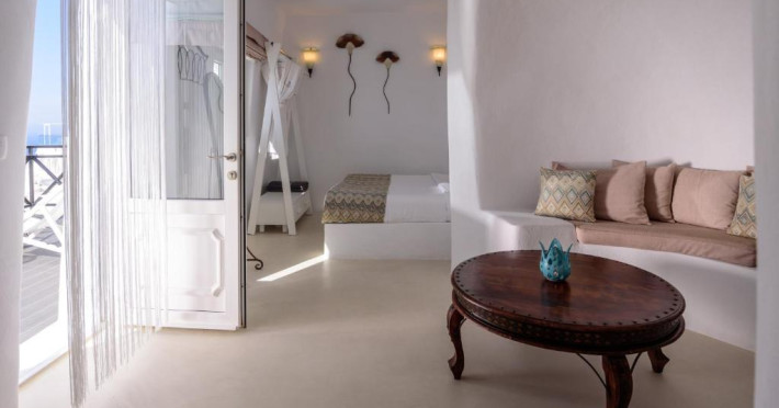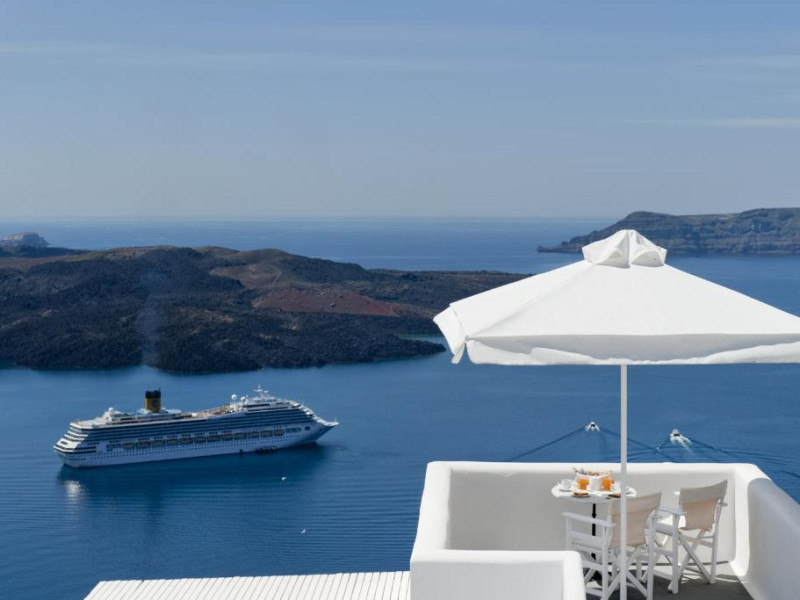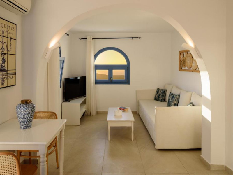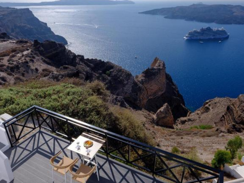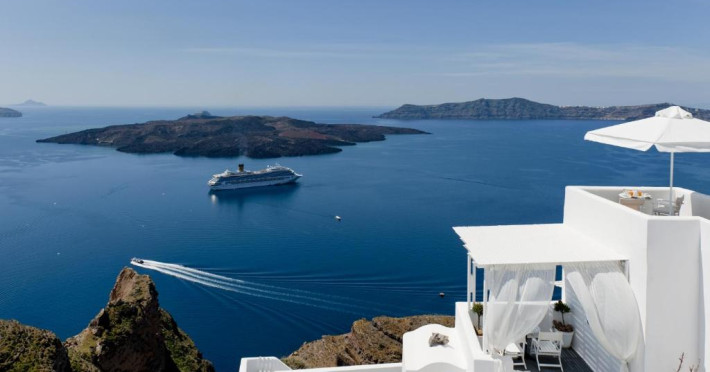 Proprietatea in stil cicladic Kamares Apartments oferă apartamente elegante cu vedere la caldeiră, la vulcan și la apusul de soare. Se află pe faleza impresionantă a orasului Fira de pe insula Santorini.