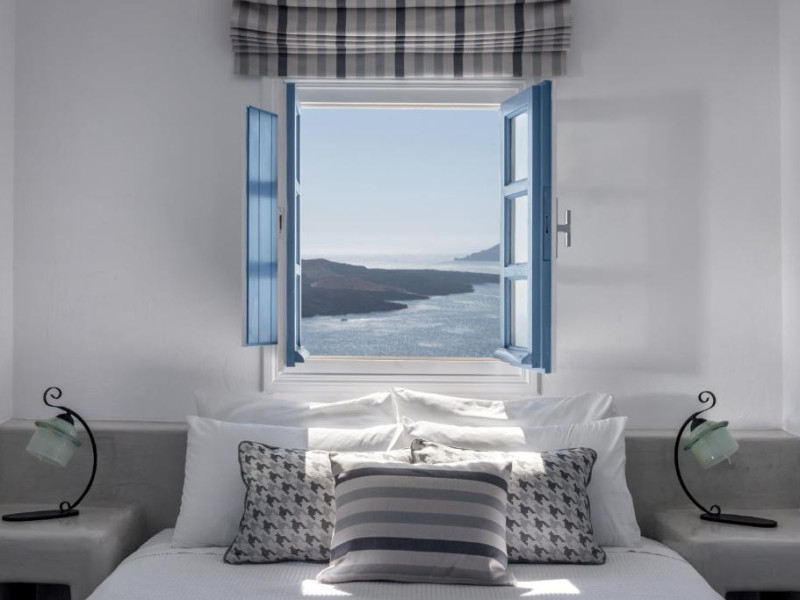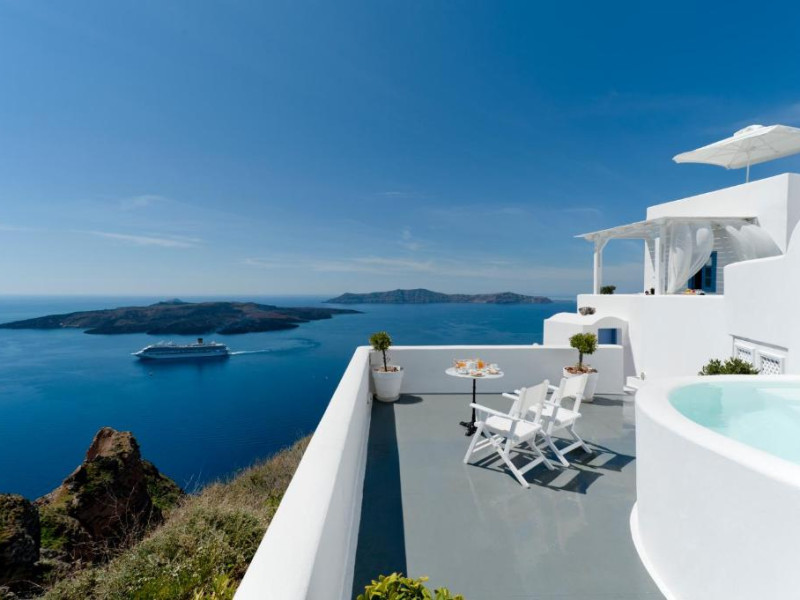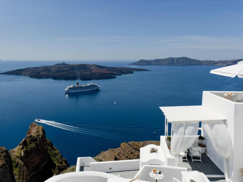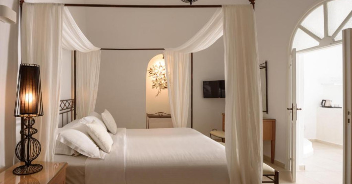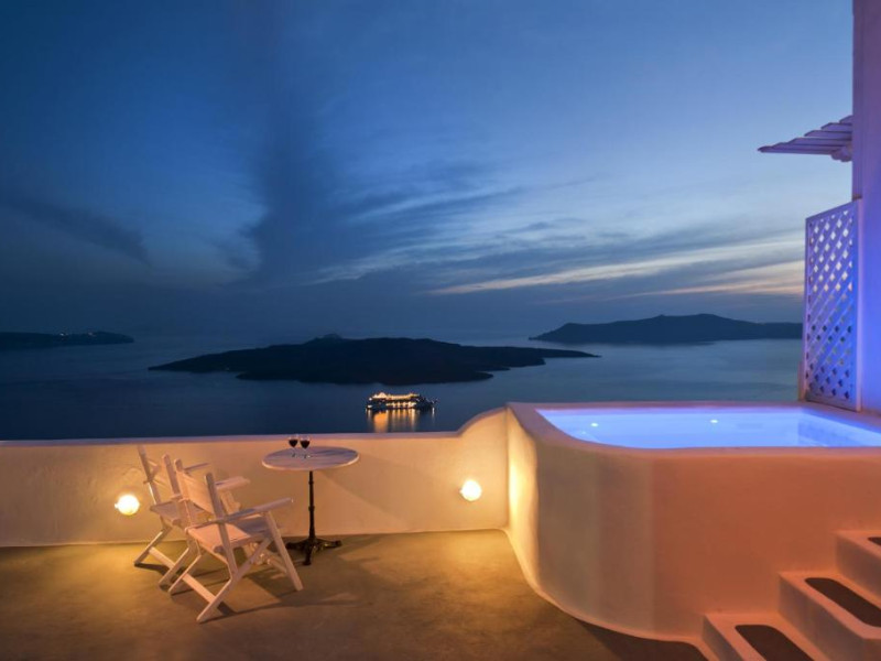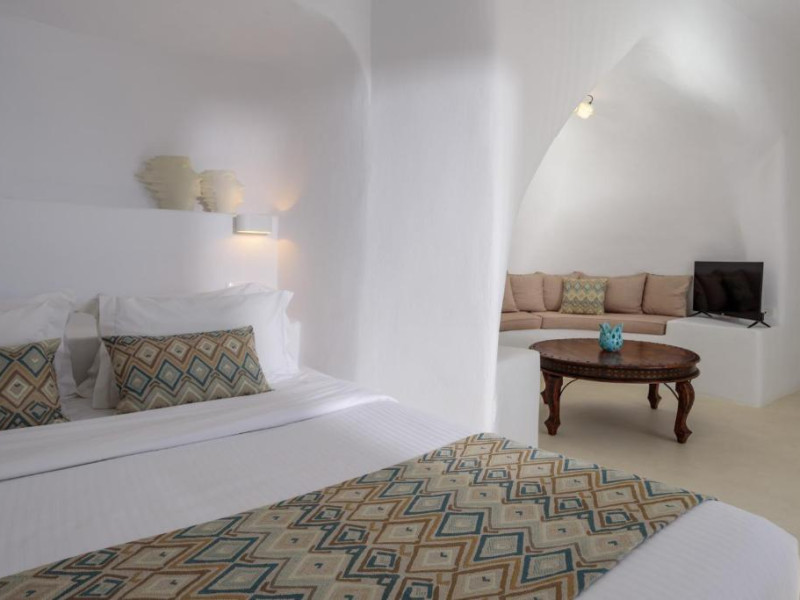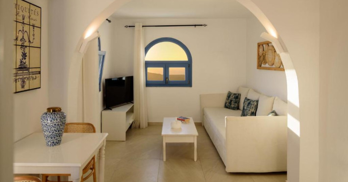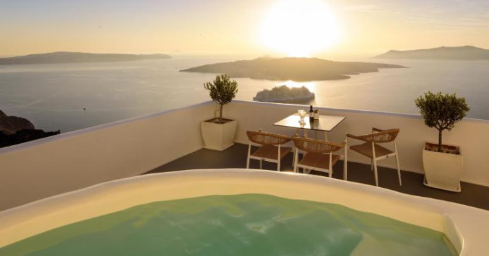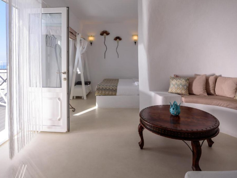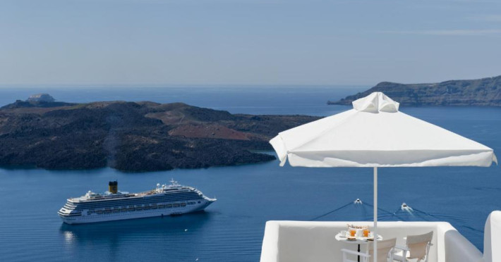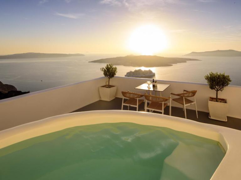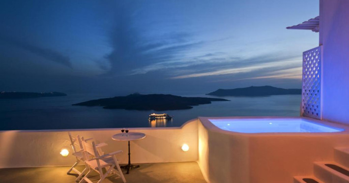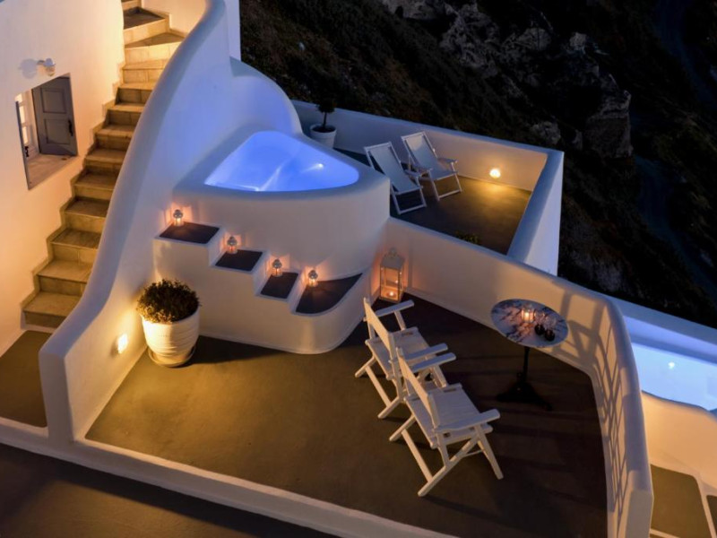 Proprietatea in stil cicladic Kamares Apartments oferă apartamente elegante cu vedere la caldeiră, la vulcan și la apusul de soare. Se află pe faleza impresionantă a orasului Fira de pe insula Santorini.