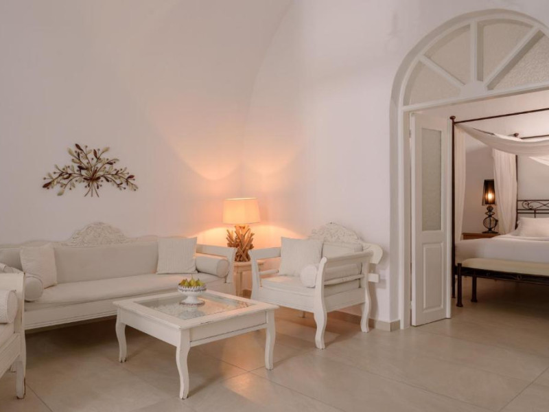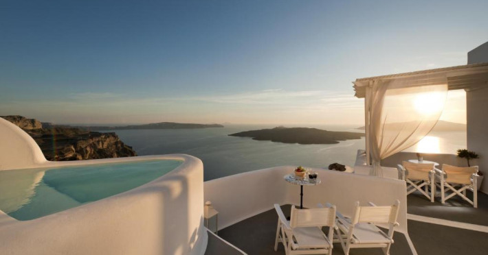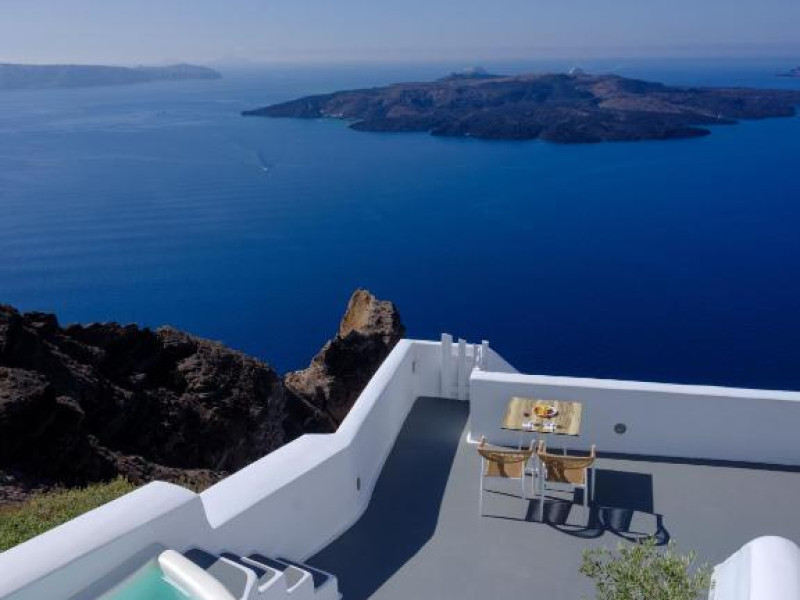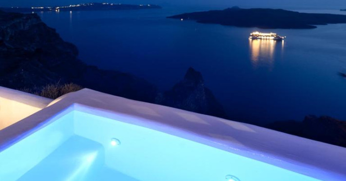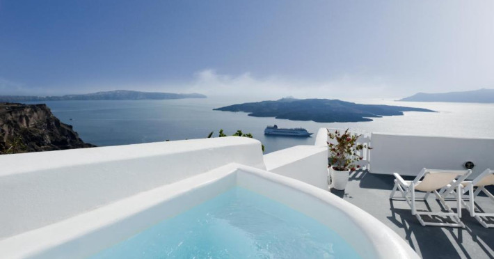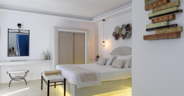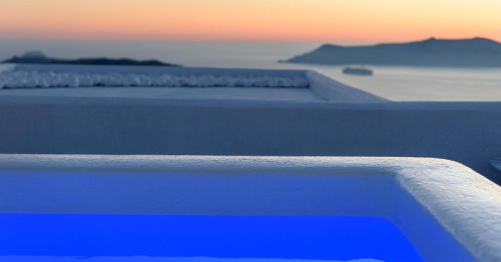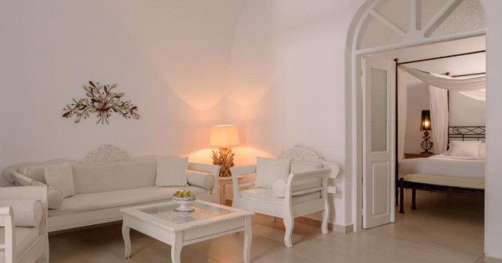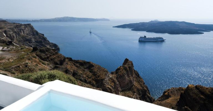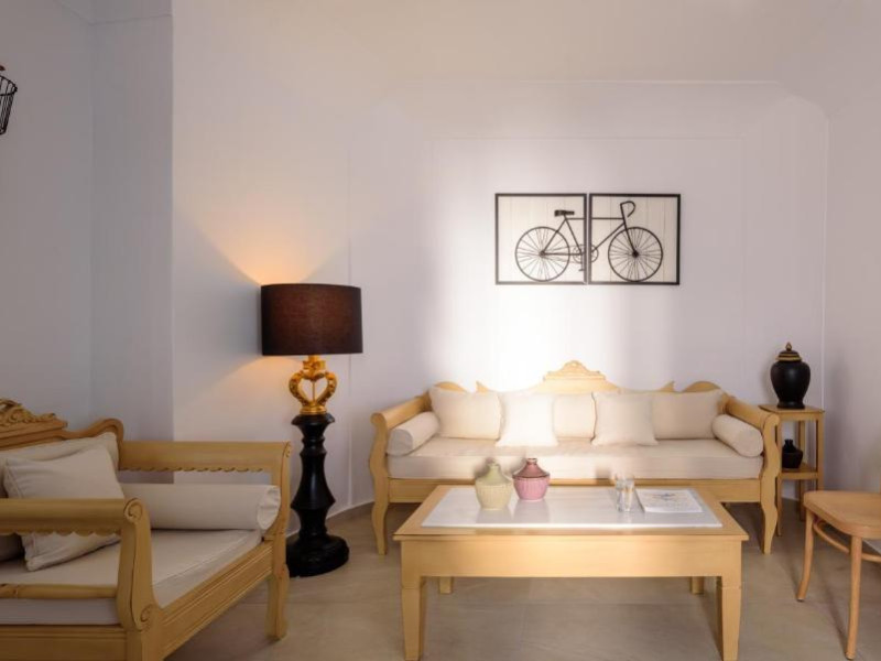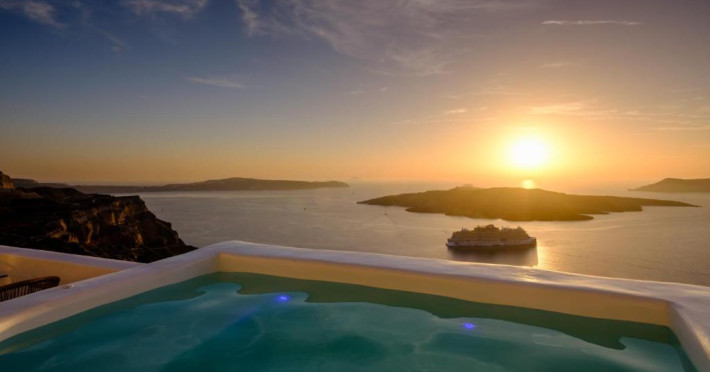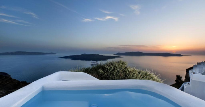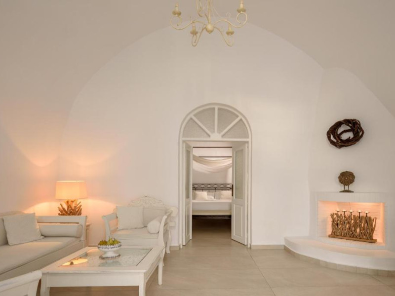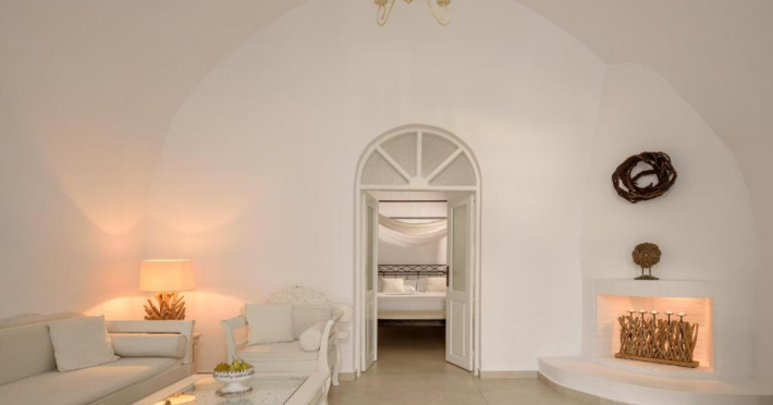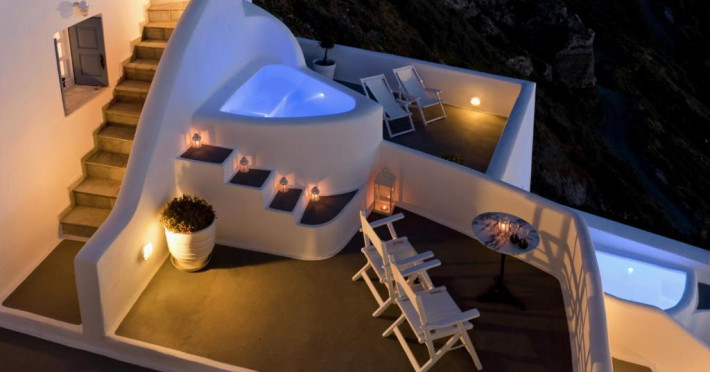 Proprietatea in stil cicladic Kamares Apartments oferă apartamente elegante cu vedere la caldeiră, la vulcan și la apusul de soare. Se află pe faleza impresionantă a orasului Fira de pe insula Santorini.