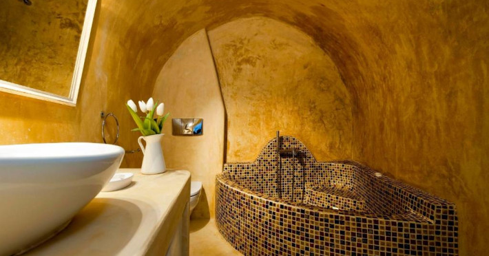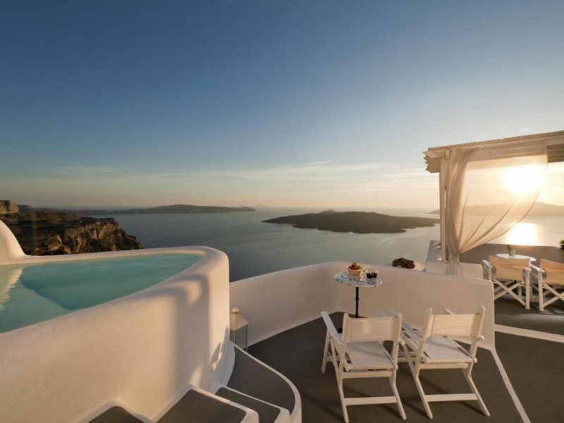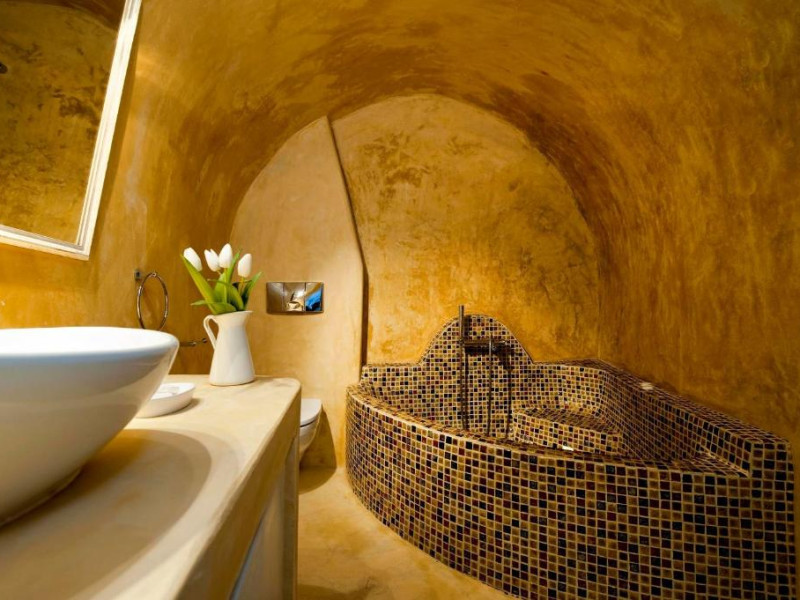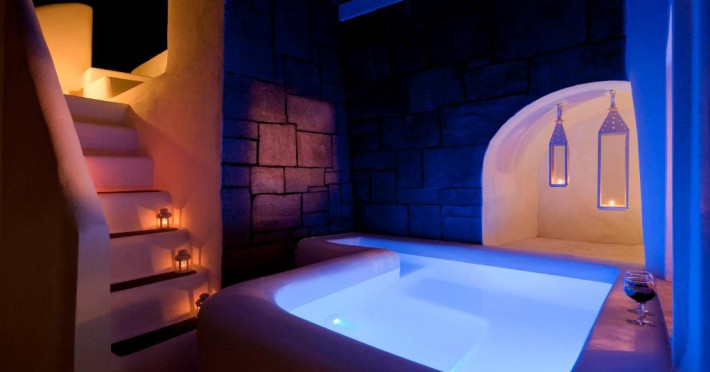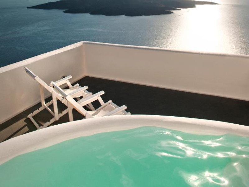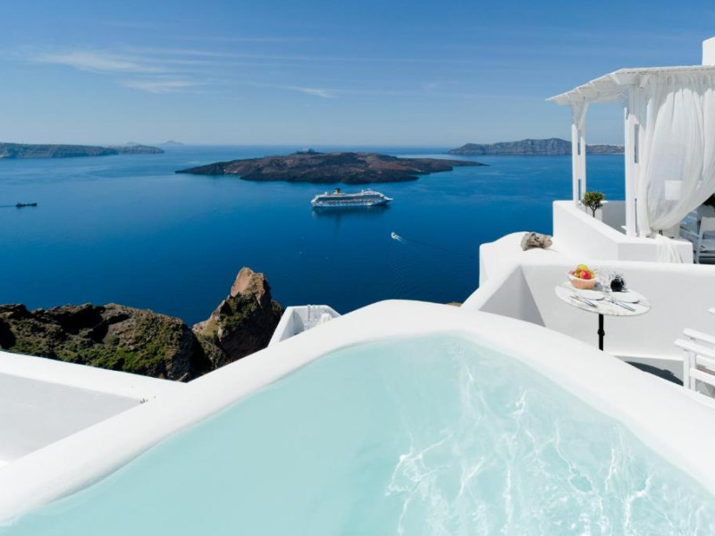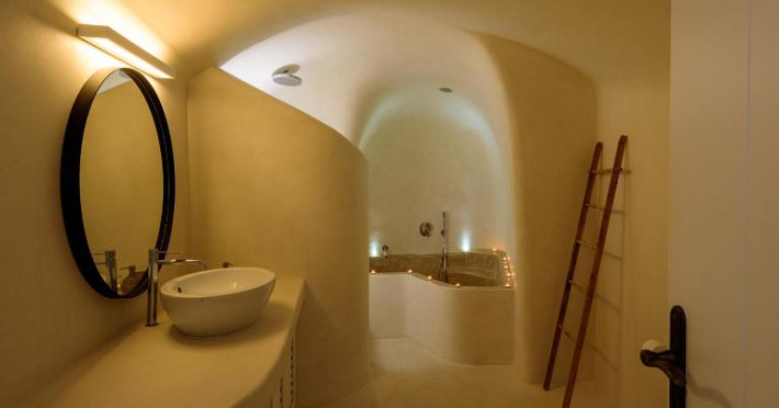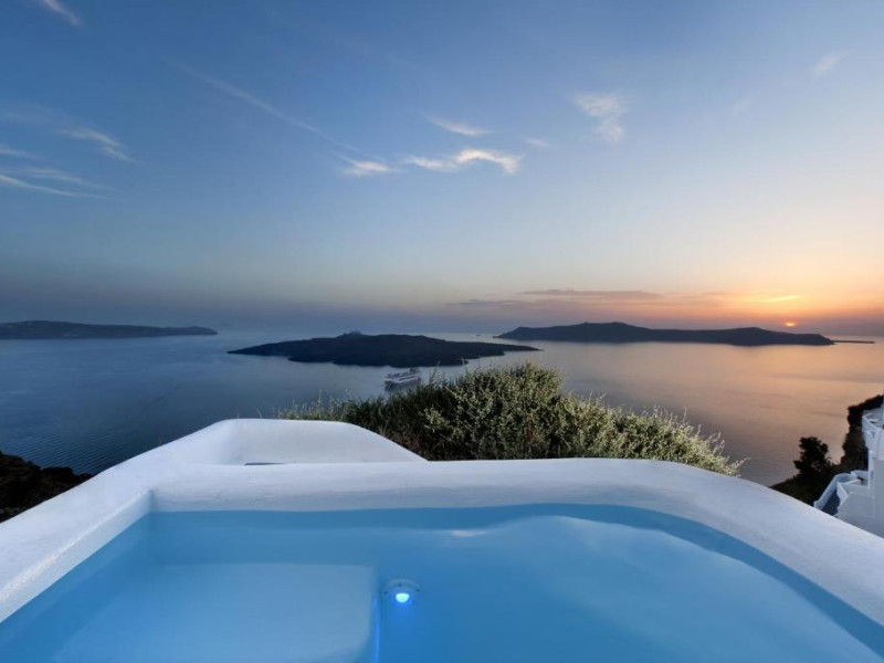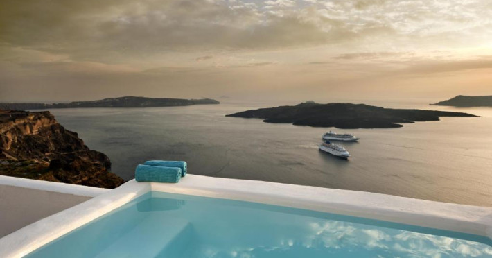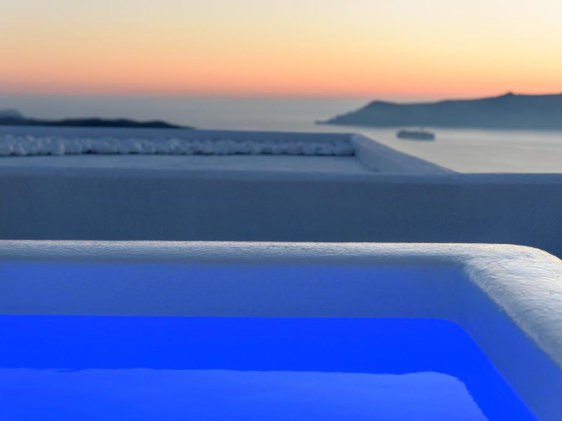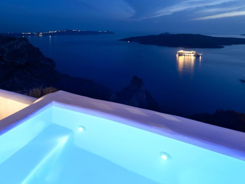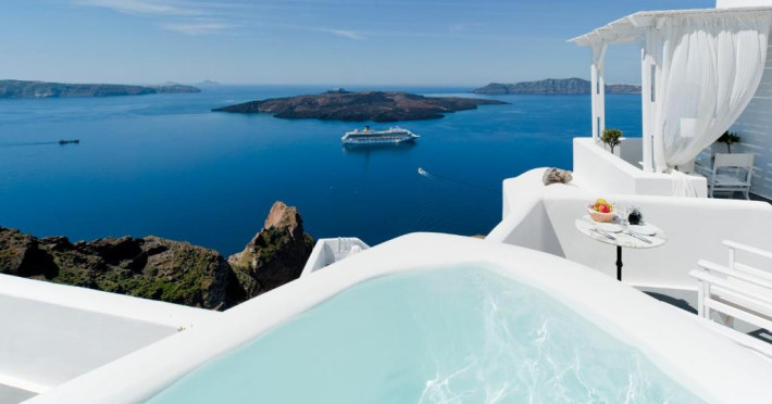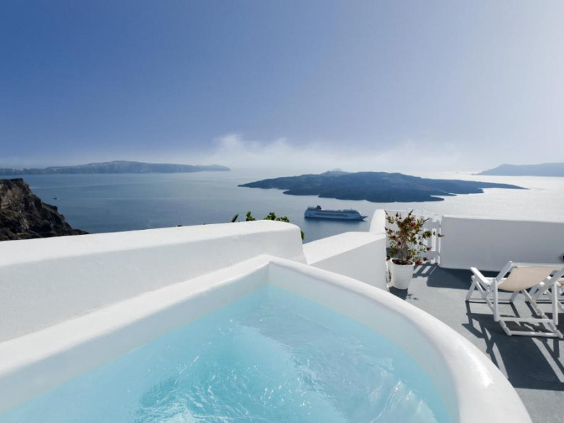 Proprietatea in stil cicladic Kamares Apartments oferă apartamente elegante cu vedere la caldeiră, la vulcan și la apusul de soare. Se află pe faleza impresionantă a orasului Fira de pe insula Santorini.