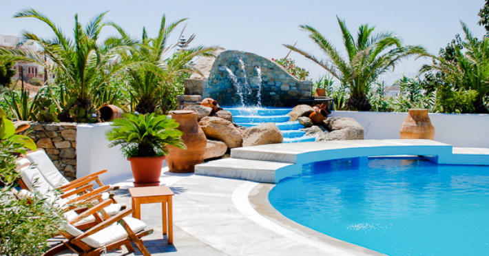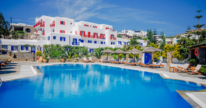 Hotelul este situat in statiunea Platis Gialos in sud vestul insulei, la aproximativ 200 m de plaja cu acelasi nume si de Psarou Beach. Tot langa hotel, la aproximativ 100 m se afla un mini market iar la 20 m statia de autobus. Distanta pana la aeroport este de 3.5 km iar pana in orasul Mykonos de 4 km.