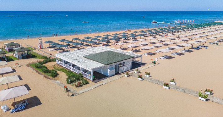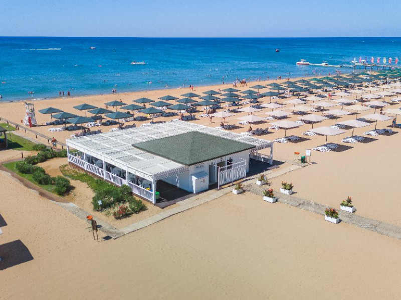 Plaja privata cu nisip, sezlongurile si umbrelele sunt gratuite.
