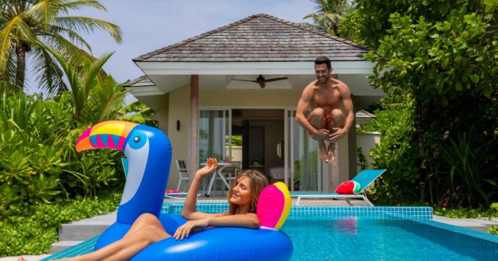 Situat la un zbor de 30 de minute de Male, urmat de o plimbare de 20 de minute cu barca pe insulă, complexul are studiouri și vile cu terasă privată și piscină privată. Acestea oferă vedere tropicală nesfarșită.