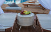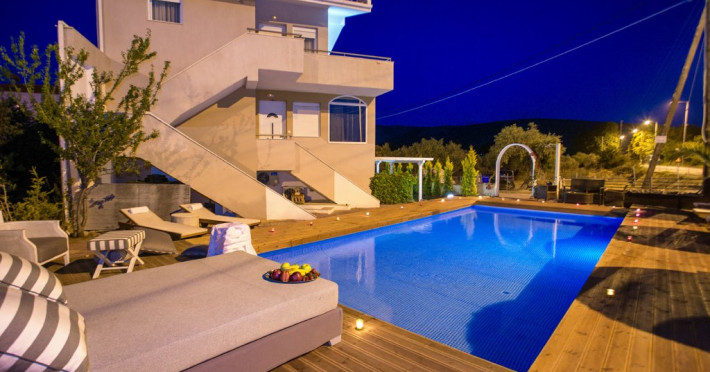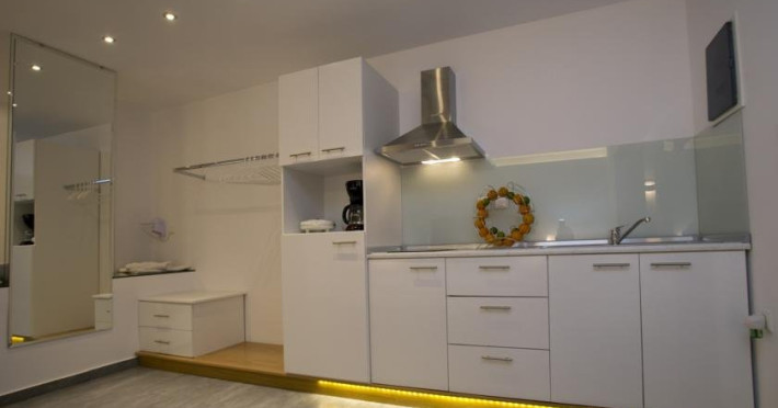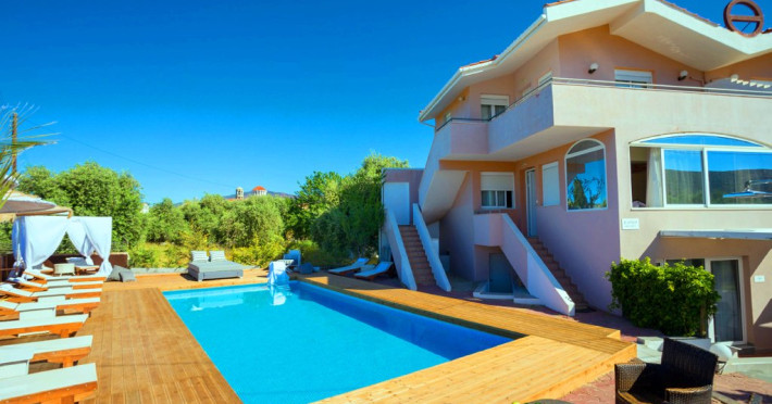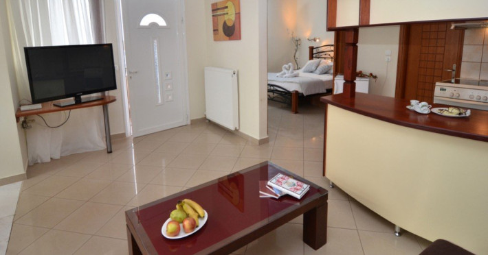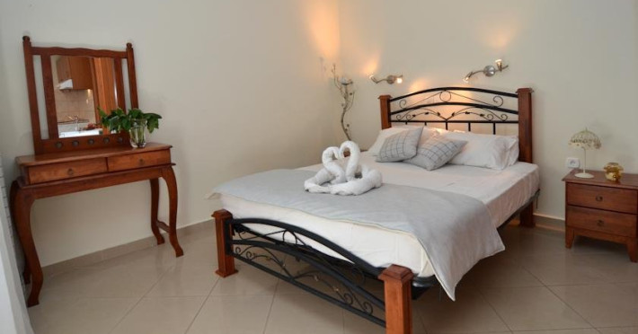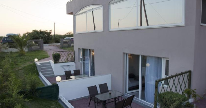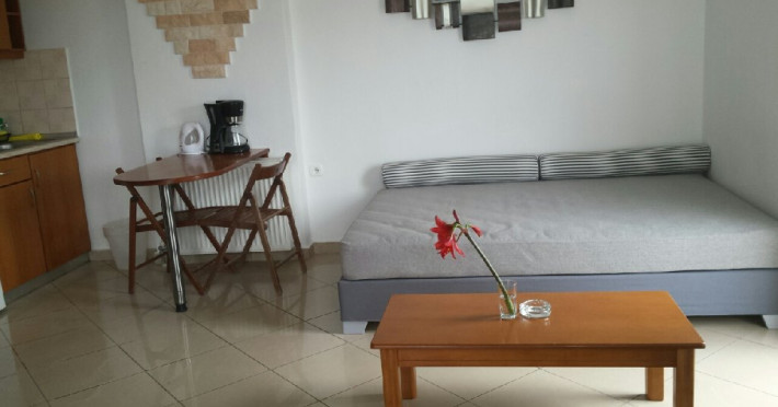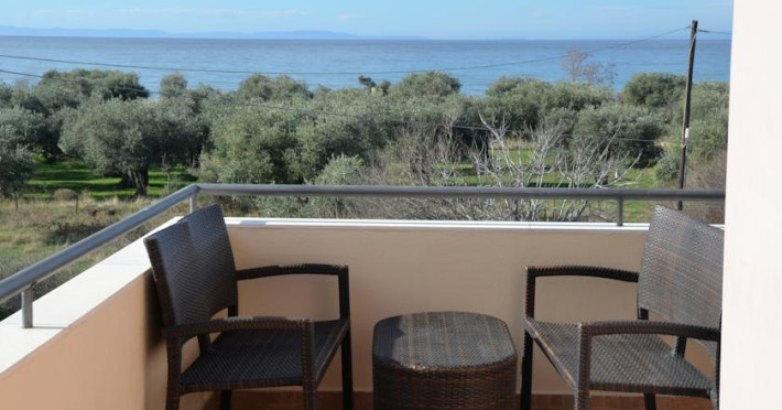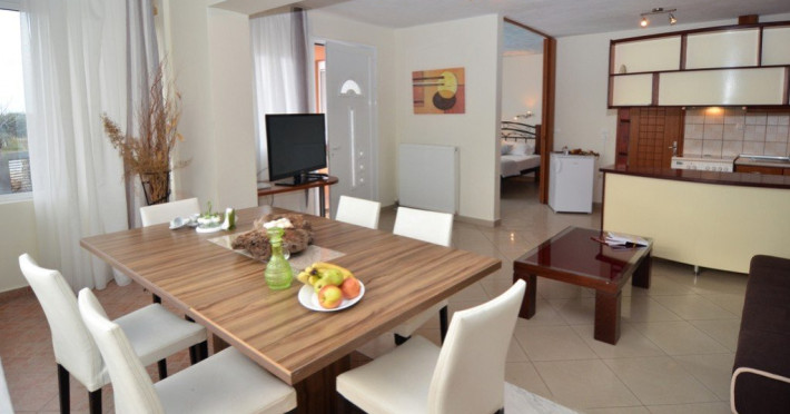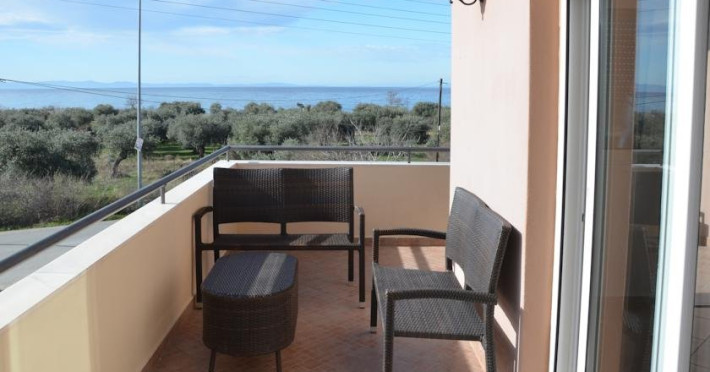 Exista 2 apartamente cu vedere la mare, la ultimul etaj. Fiecare are un dormitor cu un pat dublu si o sufragerie cu o canapea extensibila dubla. Aceste apartamente au un balcon sau terasa mare, cu vedere directa sau vedere latera la mare, o chicineta bine echipata si o baie cu dus.