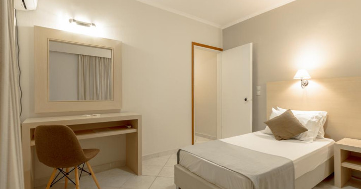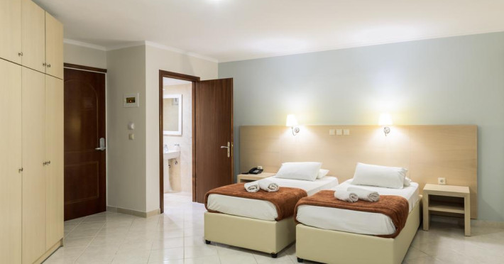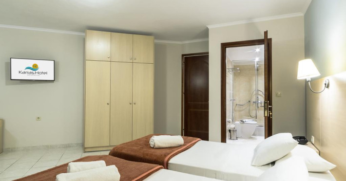 Sunt disponibile 62 camere. Oaspeții au la dispoziție serviciul de room service pentru a servi masa sau diverse băuturi. Unele camere au balcon cu vedere la grădină sau la piscină. În camere există baie cu cadă sau duș prevăzută cu foehn. Camerele confortabile de la Karras au pardoseală de gresie/ marmură, aer condiționat, Tv cu canale prin satelit și seif. Oaspeții au acces gratuit la serviciul Wi-fi în camere. Curățenia in cameră se face zilnic. Fiecare unitate de cazare are frigider. Proprietatea oferă camere pentru familie cu o suprafață mai mare și un număr mai mare de paturi față de cele standard.