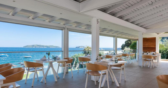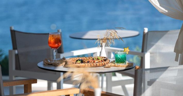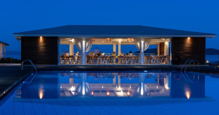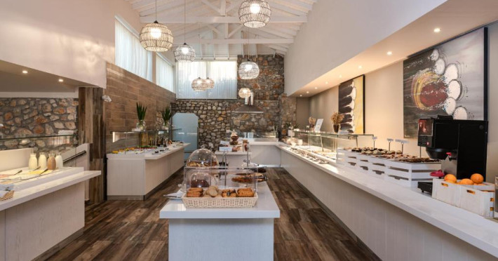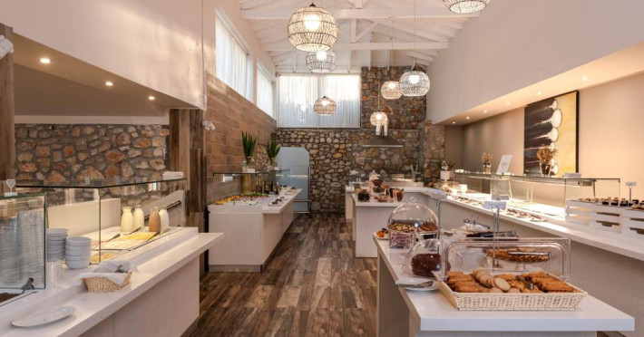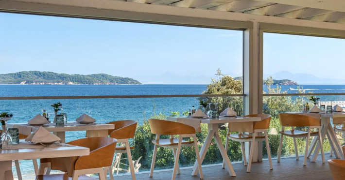 La restaurantul principal, Amvrosia, se poate savura un mic dejun grecesc, iar oaspeții pot lua preparate culinare ușoare și gustări la snack barul Pergola și pranzul sau cina, la restaurantul à la carte Mesoyios. Restaurantul tip bufet de la Kassandra oferă și cina inclusă in regimul demipensiune. Oaspeții se pot relaxa savurand o băutură la barul de la piscină, Pelagos.