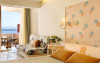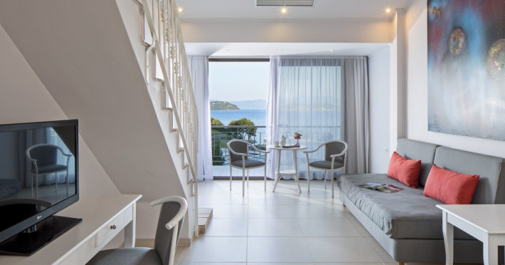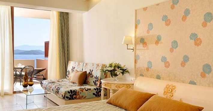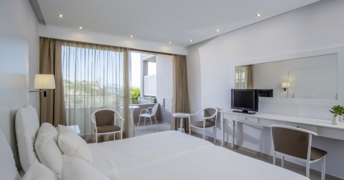 Hotelul este format din 120 de camere si 7 apartamente elegant mobilate, dotate cu toate facilitatile, in diferite stiluri si dimensiuni, cu vederi unice asupra Marii Egee. Toate camerele sunt confortabile, spatioase si dispun de balcon/terasa, baie, telefon direct, TV LCD prin satelit, aer conditionat si incalzire, seif electronic, frigider cu minibar, internet wireless, uscator de par, prosoape pentru piscina si plaja papuci.