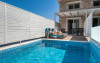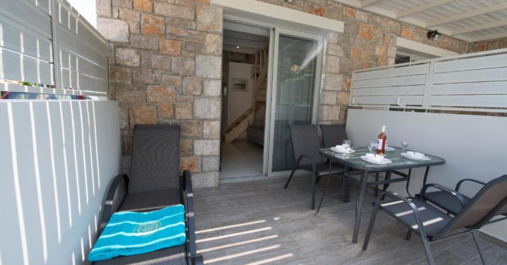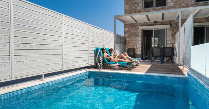 Kastro Maisonettes With Private Pool are în apropiere o plajă cu nisip. Pe plajă există șezlonguri și umbrele de plajă contra cost.