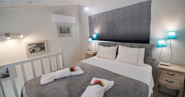 Camerele luminoase de la Kastro Maistro sunt dotate cu aer condiționat, Tv și seif. Fiecare cameră dispune de cană-fierbător. Unele camere au balcon cu vedere la mare sau la piscină. În camere există baie cu cadă sau duș prevăzută cu foehn. Oaspeții au acces gratuit la serviciul Wi-fi în camere. Curățenia in cameră se face zilnic. Fiecare unitate de cazare include o chicinetă utilată cu frigider, plită de gătit și ustensile de bucătărie. De asemenea, sunt disponibile o zonă de luat masa și un cuptor cu microunde. Proprietatea oferă camere pentru familie cu o suprafață mai mare și un număr mai mare de paturi față de cele standard.