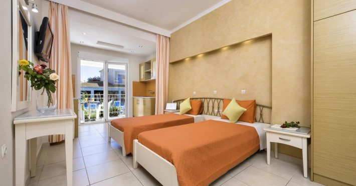 Sunt disponibile 43 camere. Camerele de la Kavos Plaza sunt dotate cu aer condiționat, Tv cu canale prin satelit și seif. În camere există baie cu duș prevăzută cu foehn. Unele camere au balcon, cu vedere la piscină, unde oaspeții se pot relaxa în voie. Fiecare cameră dispune de mașină pentru preparare cafea sau ceai. Oaspeții au acces gratuit la serviciul Wi-fi în camere. Curățenia in cameră se face zilnic. Proprietatea oferă camere pentru nefumători.
