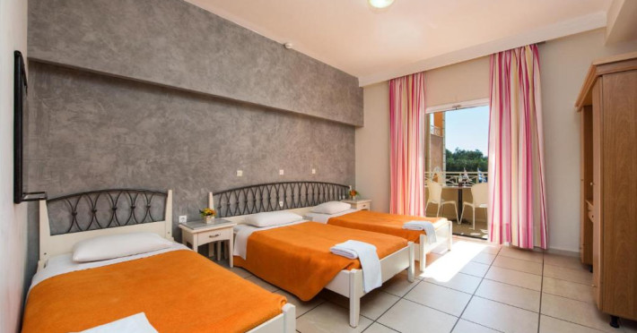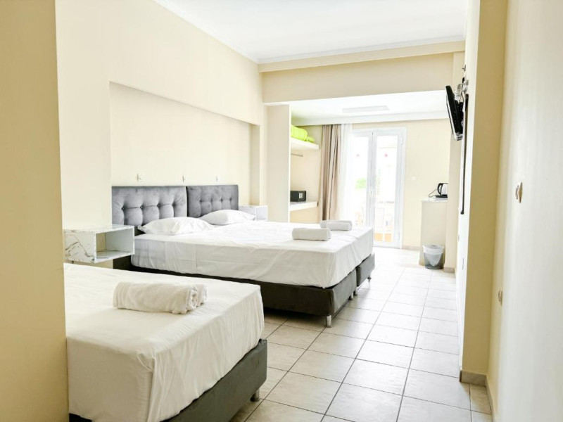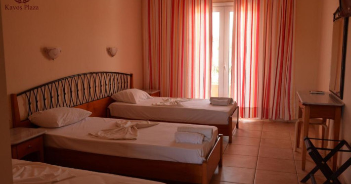 Toate camerele hotelului includ balcon privat cu vedere la piscină. Toate au baie privată, cu uscător de păr. La Kavos Plaza Hotel, toate camerele sunt dotate cu TV cu ecran plat și canale prin satelit.