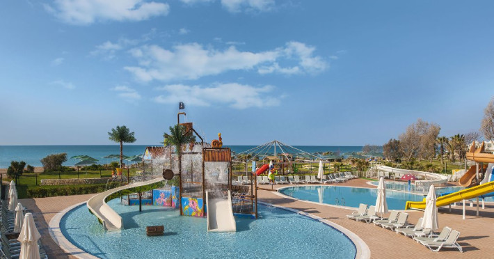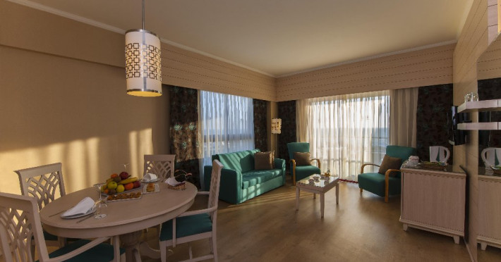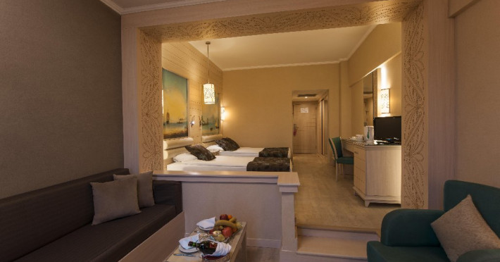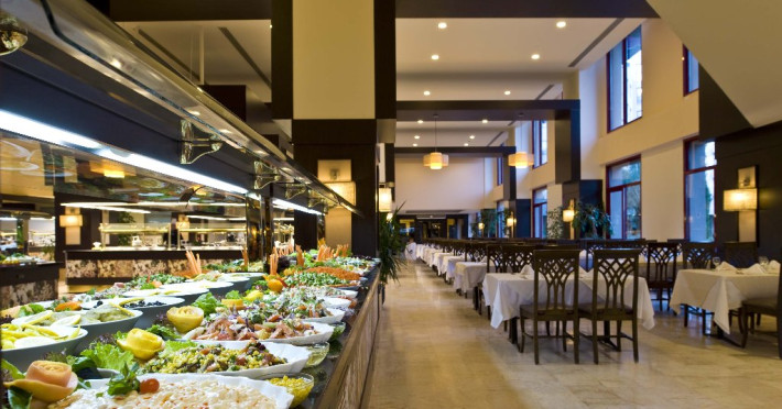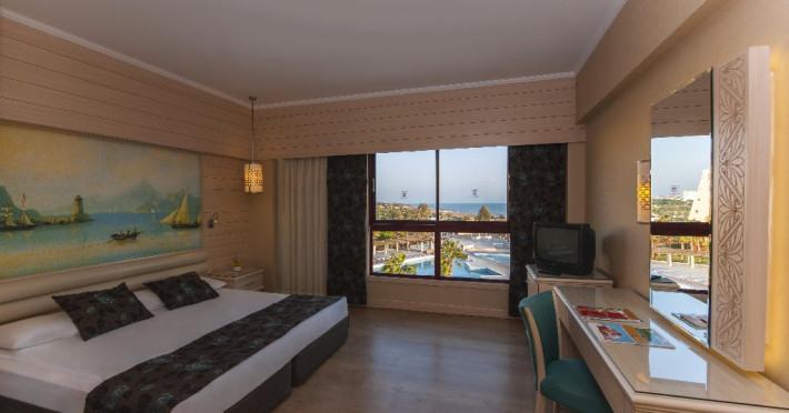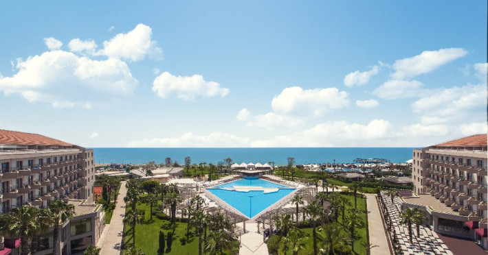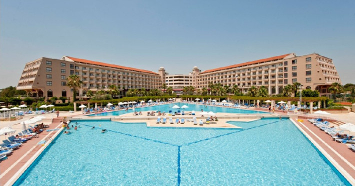Facilitati hotel: Hotelul dispune de: un restaurant principal, 4 restaurante a la carte ( cu specific Italian, asian, turcesc si barbeque), 4 baruri ( lobby, piscina, plaja, discoteca), 2 piscine exterioare, o piscina interioara, piscina pentru copii, topogan, sezlong, prosoape, umbrele, plaja privata, baie turceasca, wifi, dicoteca, centru de fitness, sauna, activitati sportive ( tenis, fotbal, volei, gimnastica si aerobic, canoe, biciclete pe apa, echipamente sportive), club pentru copii, sala de conferinte, mini discoteca. Serviciile contra cost sunt: magazine, masaj, doctor, biliard.