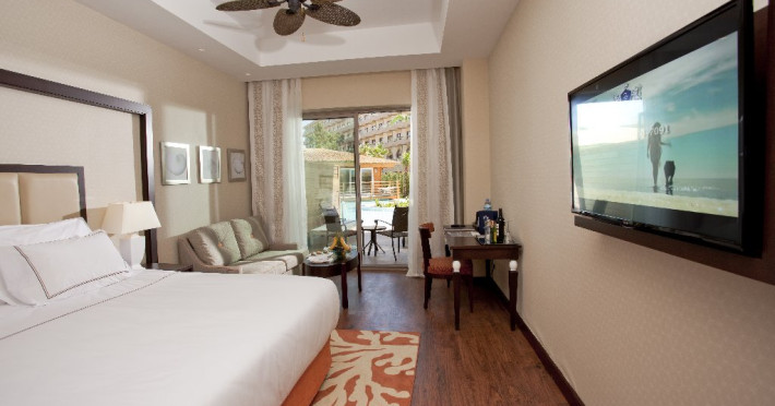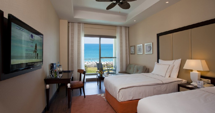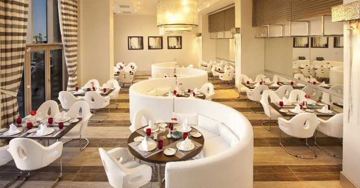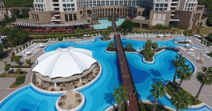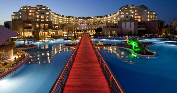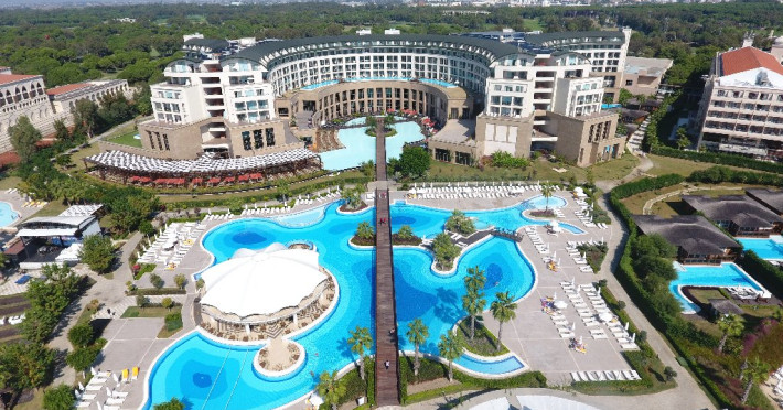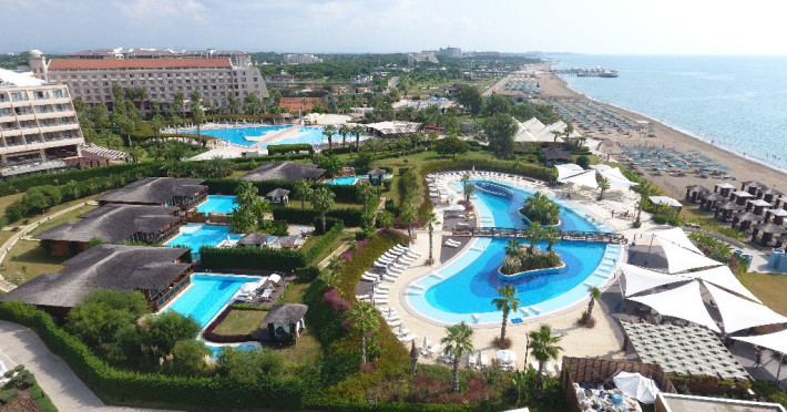Facilitati hotel: Hotelul dispune de restaurant principal, patiserie, baruri, restaurante Ala carte (cu specific italian, asiatic, mediteranean, libanez - contra cost, cu rezervare in prealabil), 2 restaurante pentru copii, mini junior club pentru copii 4 - 12 ani, teenage club pentru copii intre 13 - 16 ani, centru SPA, fitness, sauna, baie turceasca, baie cu aburi, sali de conferinta, doctor, spalatorie, plaja privata (200m lungime, include si ponton; sezlongurile si umbrelutele sunt oferite gratuit), piscina exterioara, piscina pentru copii, piscina interioara incalzita, aqua park cu 7 tobogane pentru adulti si 4 pentru copii, jocuri la piscina, lectii de gatit, cursuri de dans, volei la piscina, program de animatie seara, internet cafe, disco in aer liber, cinema, spectacole acrobatice, darts, masa de tenis, hidrobiciclete, baschet, aerobic, yoga, pilates, acces internet Wi-Fi (gratuit), teren de golf.