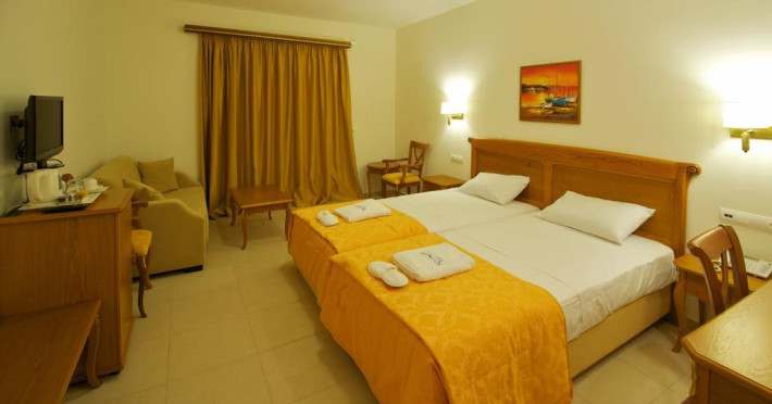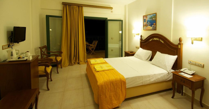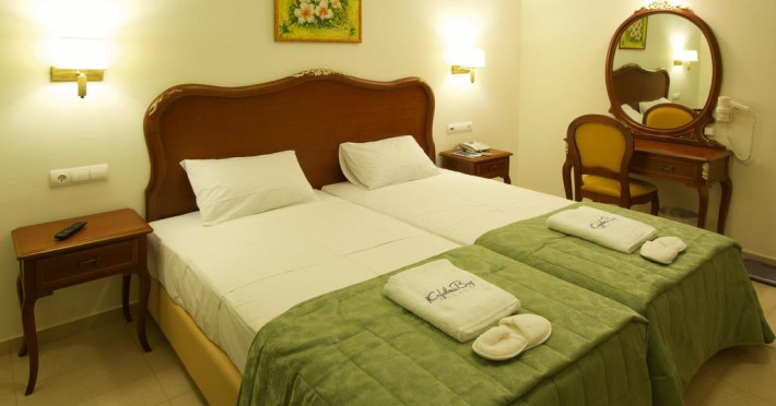Sunt disponibile 52 camere. Fiecare cameră dispune de minibar. Oaspeții pot solicita serviciul de room service pentru a servi masa sau diverse băuturi. În camere există baie cu cadă sau duș prevăzută cu foehn. Unele camere au balcon cu vedere la mare, unde oaspeții pot admira apusul sau răsăritul soarelui. Camerele de la Kefalonia Bay Palace sunt dotate cu aer condiționat, Tv cu canale prin satelit și seif. Oaspeții au acces gratuit la serviciul Wi-fi în camere. Curățenia in cameră se face zilnic. Proprietatea oferă camere pentru familie cu o suprafață mai mare și un număr mai mare de paturi față de cele standard.