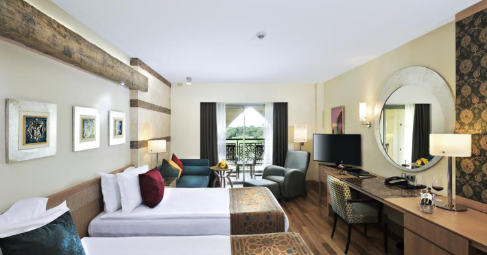 Fiecare cameră dispune de un aparat pentru preparare cafea sau ceai, cană-fierbător și minibar. Oaspeții pot solicita serviciul de room service pentru a servi masa sau diverse băuturi. Camerele luminoase de la Kempinski Hotel The Dome Belek sunt dotate cu gresie sau parchet, aer condiționat, Tv și seif. Unele camere au balcon cu vedere la mare sau la piscină. În camere există baie cu cadă sau duș, foehn, articole de toaletă gratuite, precum și halate de baie și papuci. Oaspeții au acces gratuit la serviciul Wi-fi în camere. Curățenia in cameră se face zilnic. Proprietatea oferă camere pentru familie cu o suprafață mai mare și un număr mai mare de paturi față de cele standard.
