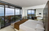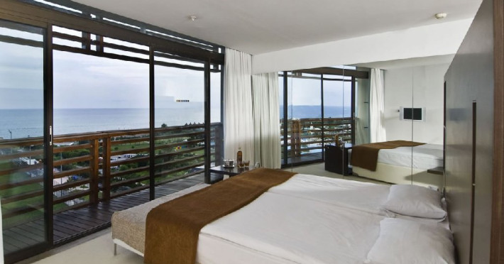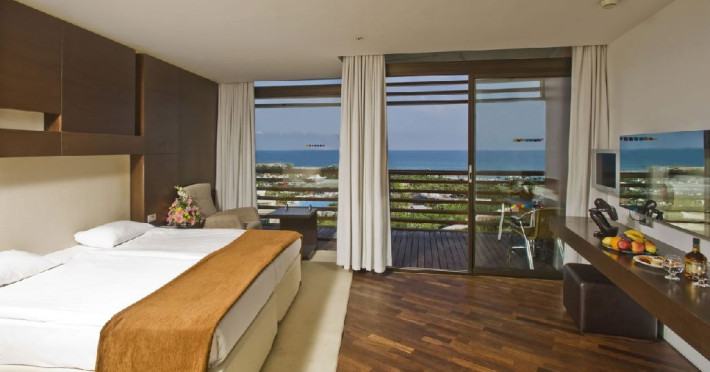 Facilitati camere: Hotelul dispune de: 579 de camere, din care: 435 camere standard (32 mp; 3 persoane), 28 camere cu vedere partiala la mare (36 mp; 3 persoane), 18 camere family (56 mp), 16 camere junior suit, 30 camere suite, o camera king suit. Sunt 6 vile saray executive (dormitor cu pat matrimonial, jacuzzi, living, piscina privata, doar pentru vile). Toate camerele sunt dotate cu balcon, baie privata cu cada si uscator de par, aer conditionat, telefon direct, minibar (reimprospatat zilnic cu bauturi racoritoare), seif si tv satelit.
