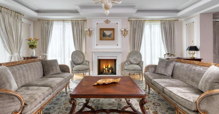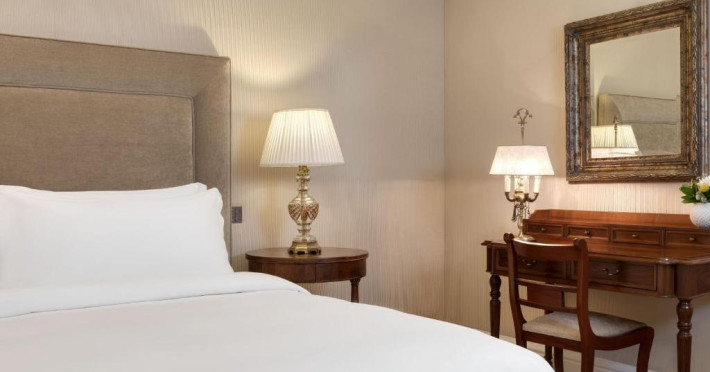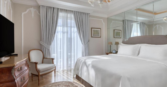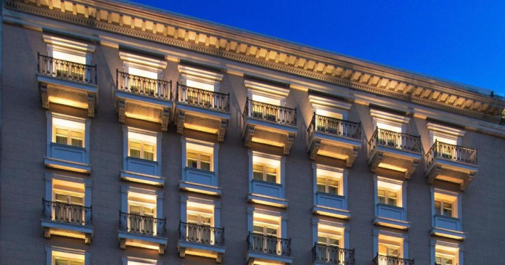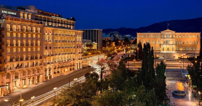 King George are o fațadă in stil neoclasic și oferă o locație excelentă in piața istorică Sintagma, intre Parlament și strada elegantă Voukourestiou. Oferă un restaurant elegant, un centru de fitness și săli de conferințe.