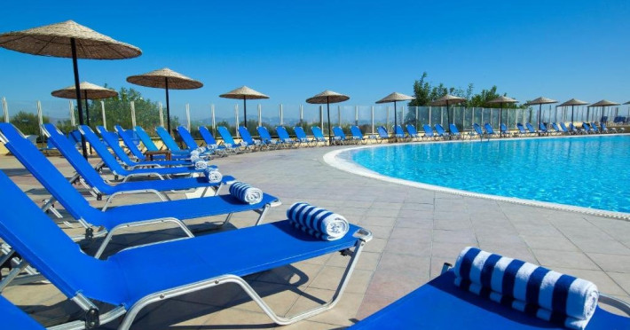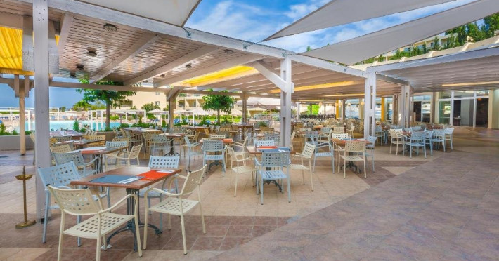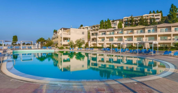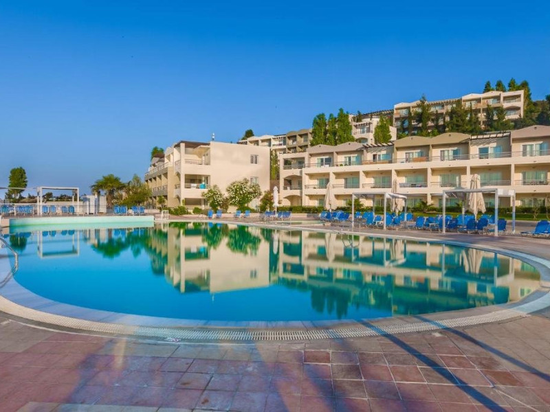 Facilitati hotel: Hotelul pune la dispozitie un parc acvatic de tip Aqualand, cu sase tobogane pentru adulti si piscine cu jocuri acvatice pentru copii, piscine exterioare pentru adulti si copii, sezlonguri si umbrele, precum si pool bar si water slides bar. Pentru copii si adolescenti sunt disponibile mini club si teens club, bufet dedicat copiilor, locuri de joaca si activitati organizate. Oaspetii pot practica diverse activitati sportive precum aerobics, aqua aerobics, yoga, tenis de masa, tenis, mini fotbal, volei pe plaja si gimnastica in apa. Hotelul dispune de restaurant, baruri, lobby lounge, mini market, amfiteatru in aer liber pentru spectacole si programe de animatie. Serviciile suplimentare includ parcare, inchiriere auto, servicii medicale la cerere, spalatorie si curatatorie (contra cost), sporturi nautice si scuba diving (contra cost). Oaspetii pot beneficia de acces la centrul de spa si wellness Hippocrates Holistic Wellness Spa, situat in cadrul hotelului Kipriotis Panorama Hotel & Suites, aflat in imediata apropiere (servicii contra cost).