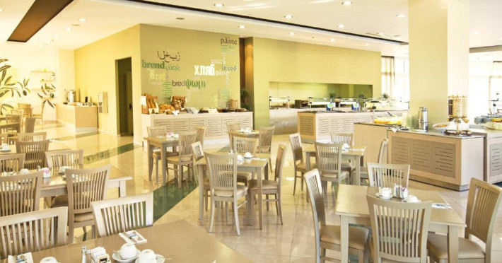 Micul dejun tip bufet este servit zilnic in zona de luat masa, iar oaspeții se pot bucura și de arome grecești și internaționale pe terasa mare a restaurantului proprietății.
