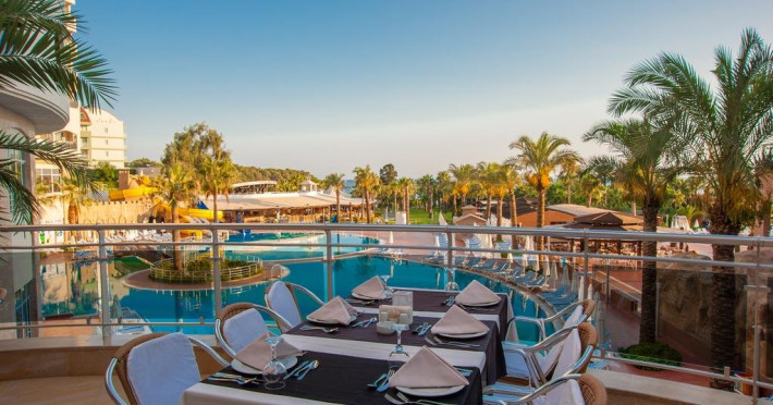 Facilitati hotel: Hotelul ofera oaspetilor sai urmatoarele facilitati: 3 restaurante a la carte (mediteranean, asiatic, turcesc), 8 baruri, piscina exterioara, 3 tobogane, piscina pentru copii, piscina interioara, programe de animatie, spectacole in amfiteatru, petreceri pe plaja si la piscina, muzica live, discoteca, aerobic, zumba, darts, tenis de masa, teren de tenis si echipament, volei pe plaja, basket, mini fotbal, sauna, hammam, mini club (4-12 ani), maxi club (13-18 ani), mini disco, loc de joaca.