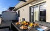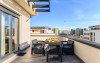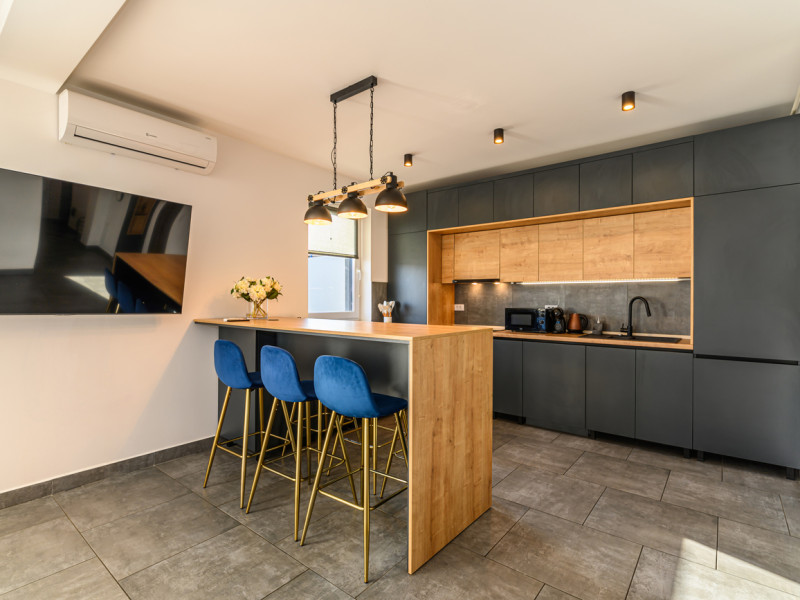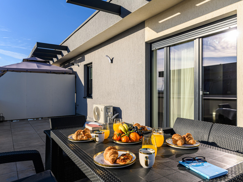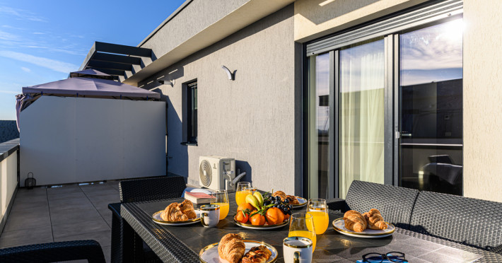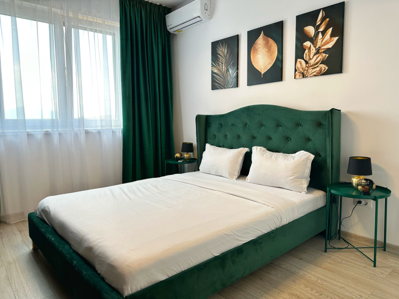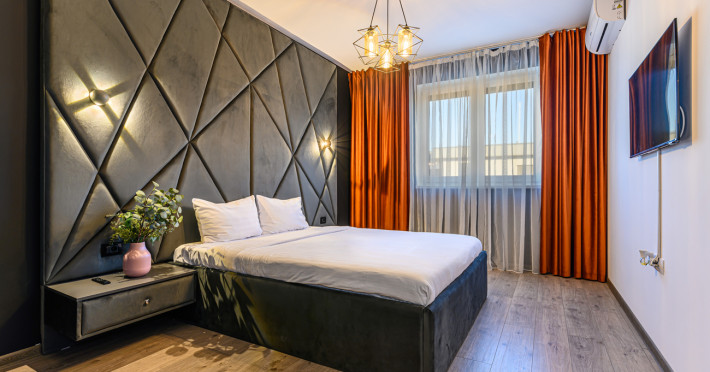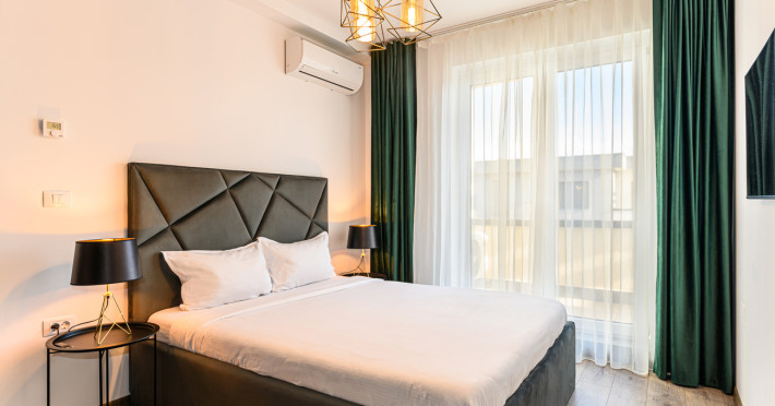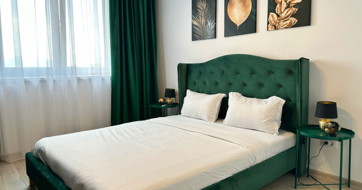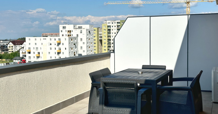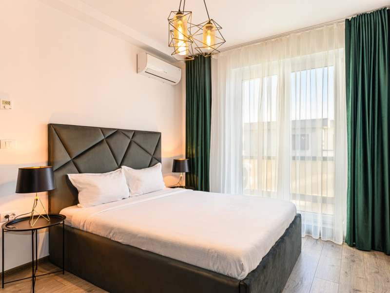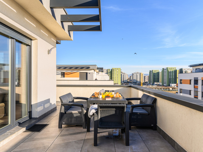 Urban Penthouse Moon Penthouse – Spatiu, liniste si confort aproape de Coresi Urban Penthouse si Moon Penthouse sunt doua penthouse-uri generoase, de 140 m², aflate in zone linistite, la doar cateva minute de Coresi Shopping Resort. Cu terase mari si privelisti frumoase, aceste locuinte sunt gandite pentru un sejur confortabil, fie ca esti in vacanta, fie intr-o calatorie de lucru. Dormitoare confortabile Fiecare penthouse are doua dormitoare spatioase, dotate cu: Paturi King Size cu saltele de calitate superioaraAer conditionatJaluzele electriceTelevizoare UHD cu Netflix gratuit Living primitor Zona de zi este ideala pentru relaxare, cu: Canapele extensibile confortabileTV UHD – perfect pentru serile linistite Bucatarii complet utilate Bucatariile sunt pregatite pentru orice, de la un mic dejun rapid la o cina gatita acasa: Frigider, cuptor, plita pe inductie, cuptor cu microundeMasina de spalat vase, aparat de cafea Dolce Gusto, fierbatorBar cu 6 locuri pentru mese in familie sau cu prietenii Bai moderne Fiecare apartament are doua bai, dotate cu: Dus walk-in si cadaMasina de spalat rufeArticole de toaleta esentiale incluse Alte facilitati utile Parcare gratuita, atat subterana cat si suprateranaDesign modern si spatiu aerisitLa cerere: patut pentru bebelusi, scaun inalt, jocuri de societate – fara costuri suplimentare