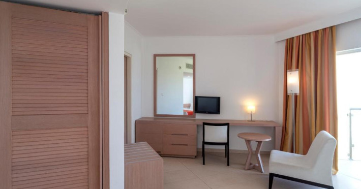 Camerele confortabile de la Kolymbia Beach By Atlantica au pardoseală de gresie/ marmură, aer condiționat și Tv cu canale prin satelit. Fiecare cameră dispune de cană-fierbător. Oaspeții au acces gratuit la serviciul Wi-fi în camere. În camere există baie cu cadă sau duș ce are în dotare foehn și articole de toaletă gratuite. Camerele au balcon cu vedere la mare, la piscină sau la grădină. Curățenia in cameră se face zilnic. Proprietatea oferă camere pentru familie cu o suprafață mai mare și un număr mai mare de paturi față de cele standard.