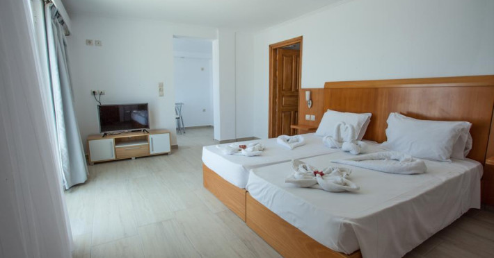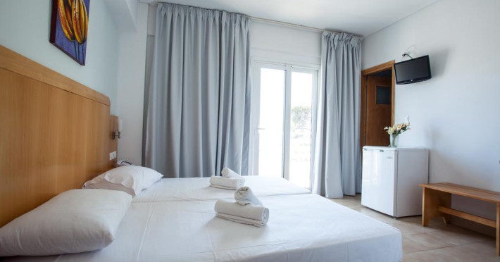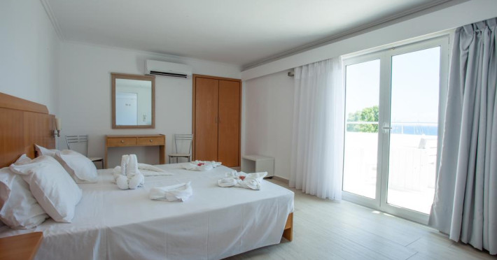 În camere există baie cu cadă sau duș ce are în dotare foehn și articole de toaletă gratuite. Unele camere au balcon cu vedere la mare sau la grădină. Camerele confortabile de la Kos Bay au pardoseală de gresie/ marmură, aer condiționat, Tv cu canale prin satelit și seif. Oaspeții au acces gratuit la serviciul Wi-fi în camere. Curățenia in cameră se face zilnic. Toate camerele spațioase de la Kos Bay au zonă de relaxare cu canapea, ceea ce oferă un plus de confort. Fiecare unitate de cazare include o chicinetă utilată cu frigider, plită de gătit și ustensile de bucătărie. De asemenea, este disponibilă o zonă de luat masa. Proprietatea oferă camere pentru familie cu o suprafață mai mare și un număr mai mare de paturi față de cele standard. Se pot rezerva de asemenea camere pentru nefumători.