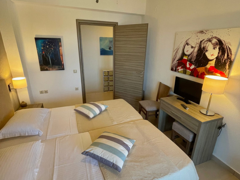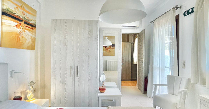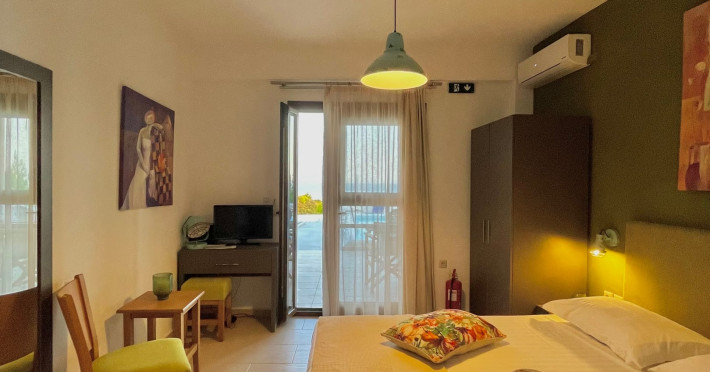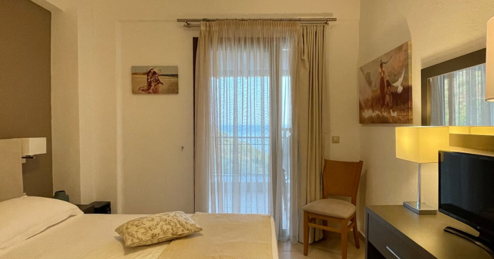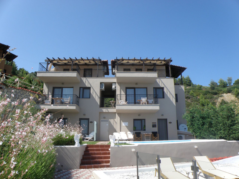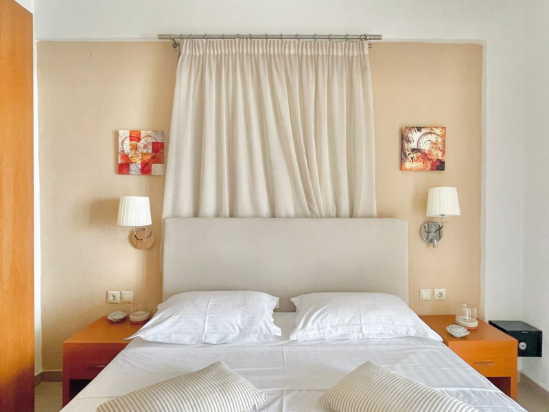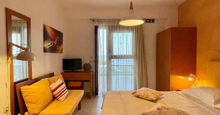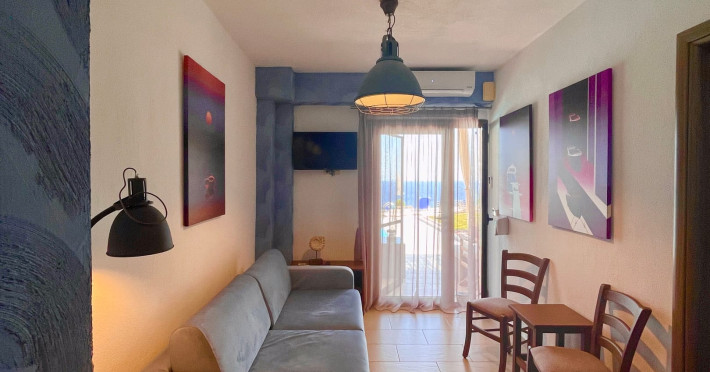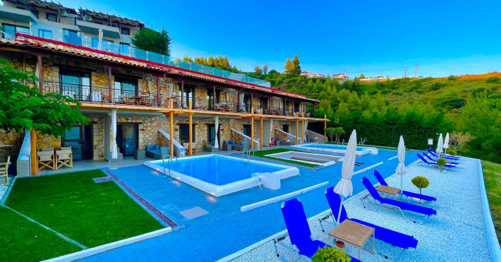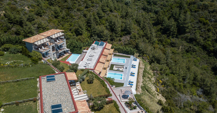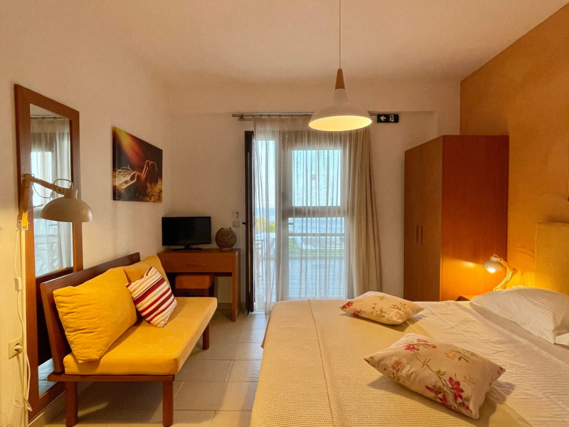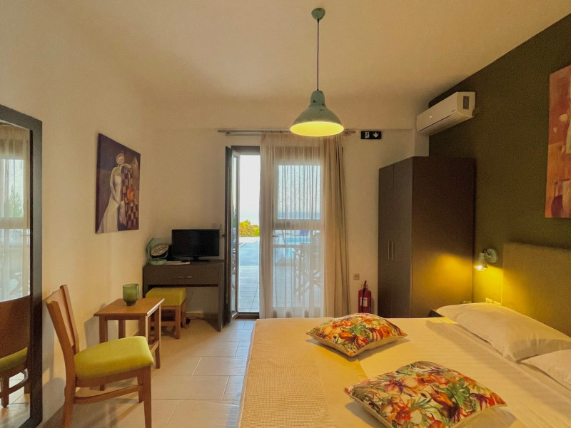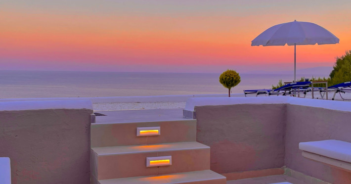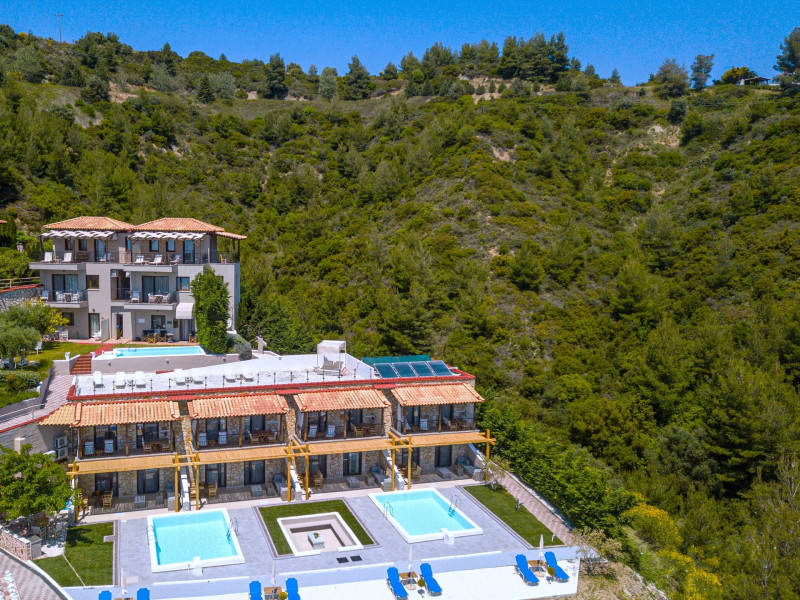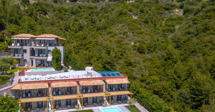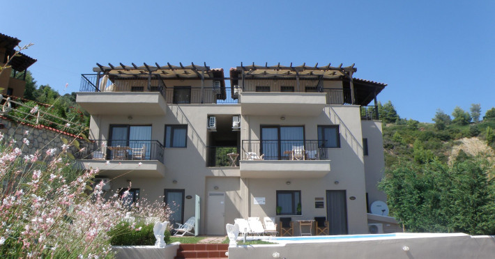 The hotel is located on a hill in front and above the sea, offering its guests a unique view to the Aegean sea and to a unique sunset, it consists of 3 buildings built in an area of 3.500 square meters, offering fully furnished rooms/apartments of various sizes and types-studios or apartments and maisonettes with one, two or three bedrooms from 2 up to 7 persons ,quality full equipment, kitchen, a/c, tv in all rooms, free wi-fi, daily cleaning service, reception desk, up on request laundry-breakfast-all day dining menu, airport shuttle etc.. All rooms have a panoramic view to the sea,