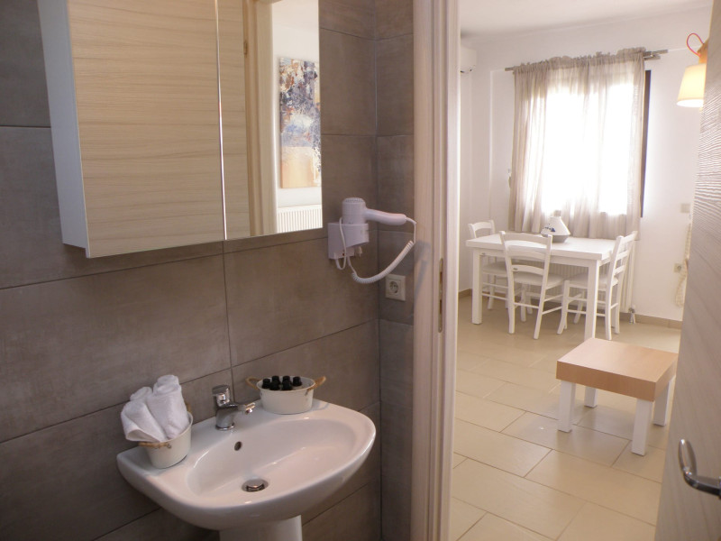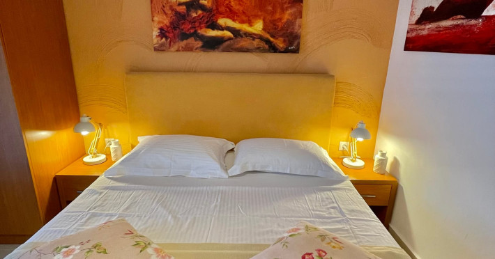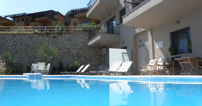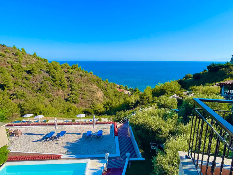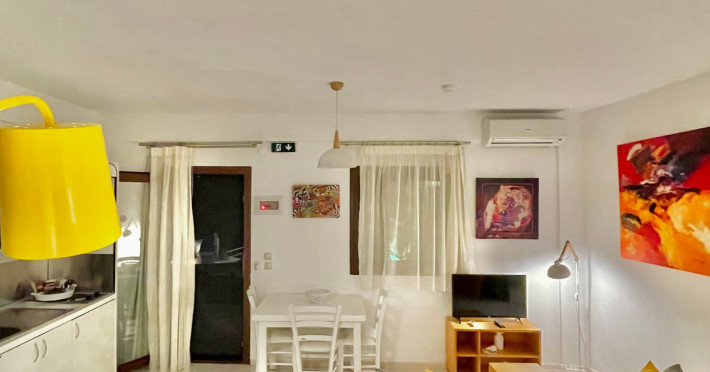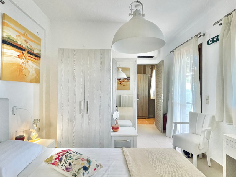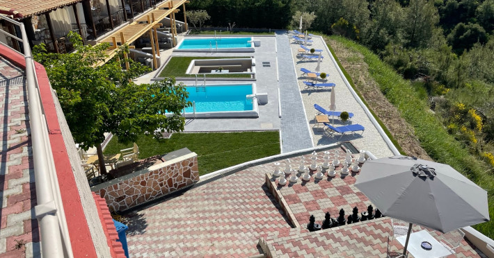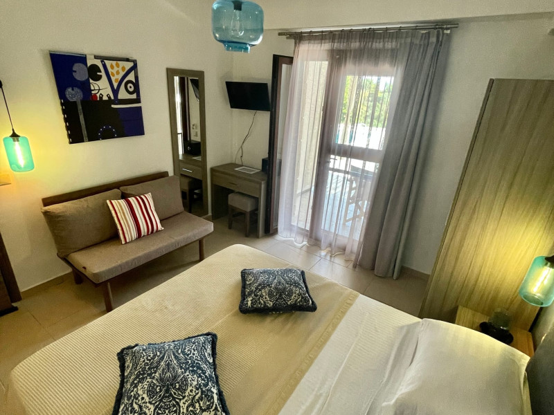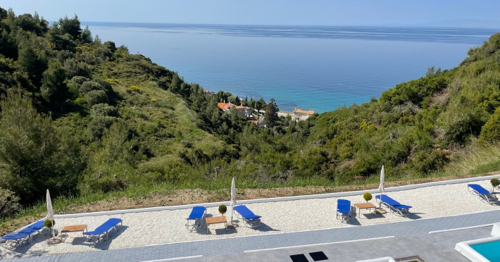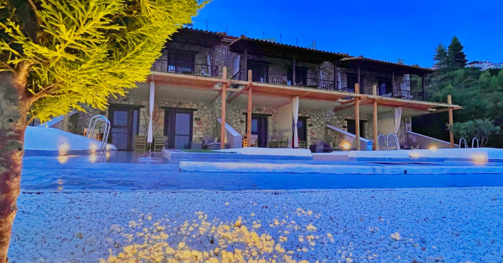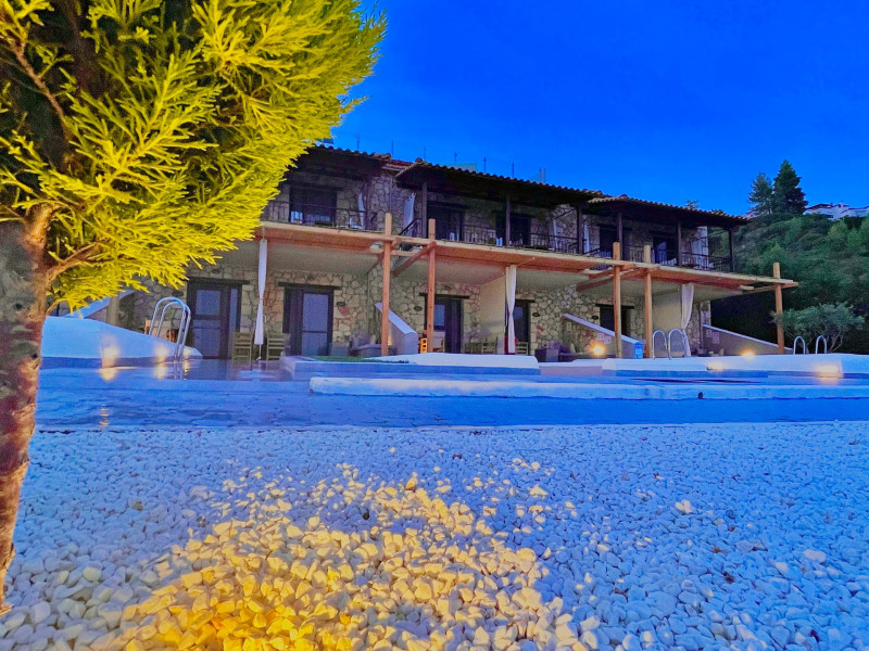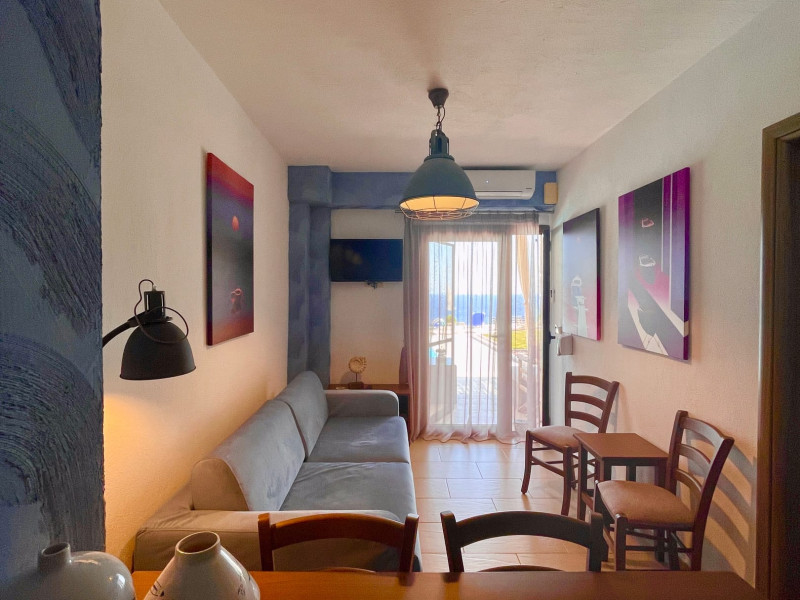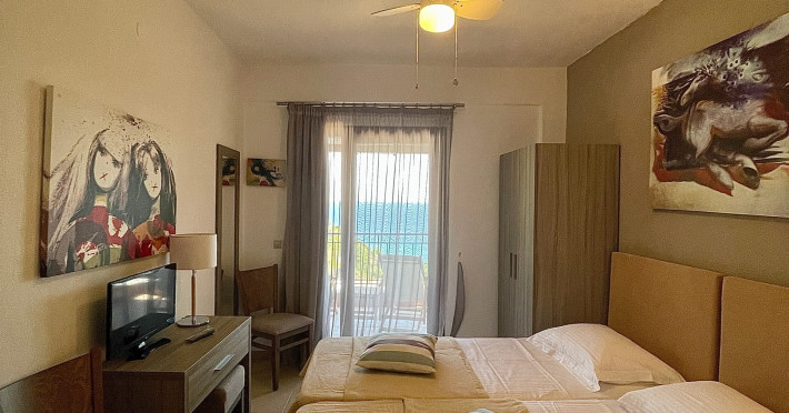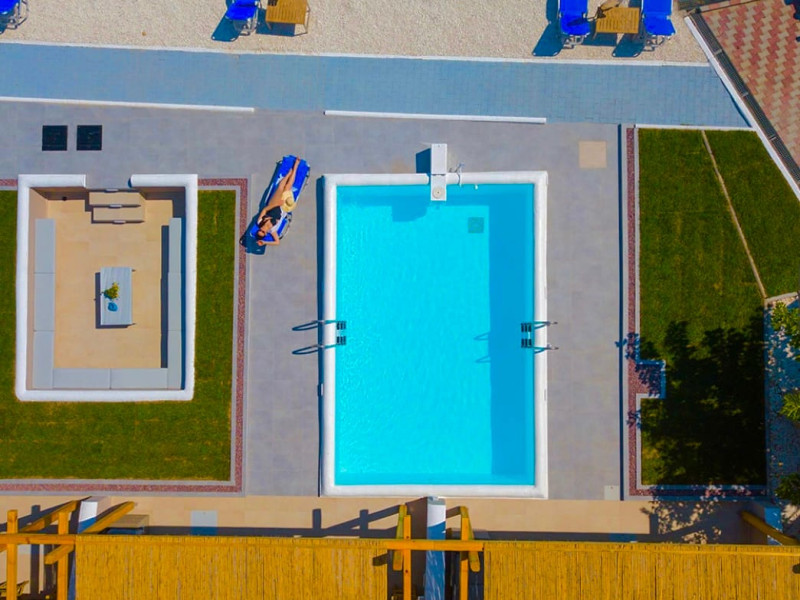 The hotel is located on a hill in front and above the sea, offering its guests a unique view to the Aegean sea and to a unique sunset, it consists of 3 buildings built in an area of 3.500 square meters, offering fully furnished rooms/apartments of various sizes and types-studios or apartments and maisonettes with one, two or three bedrooms from 2 up to 7 persons ,quality full equipment, kitchen, a/c, tv in all rooms, free wi-fi, daily cleaning service, reception desk, up on request laundry-breakfast-all day dining menu, airport shuttle etc.. All rooms have a panoramic view to the sea,