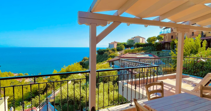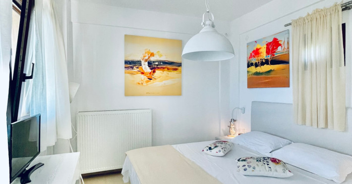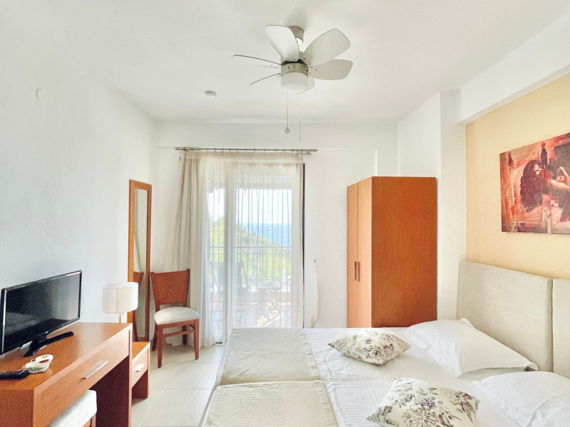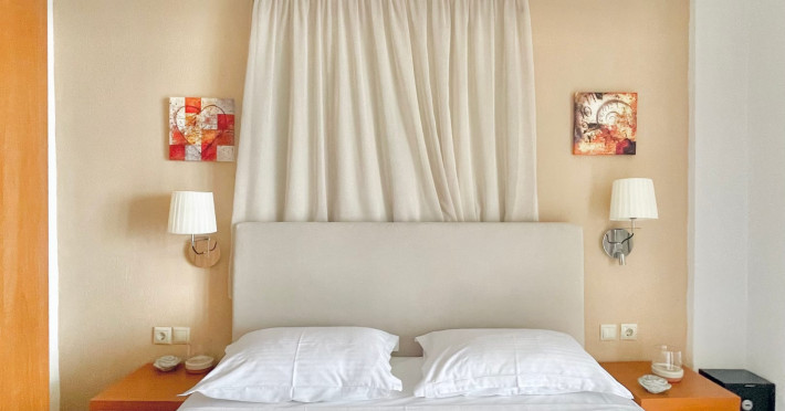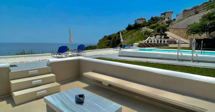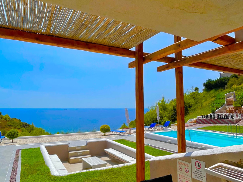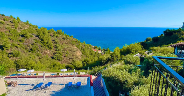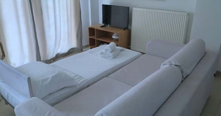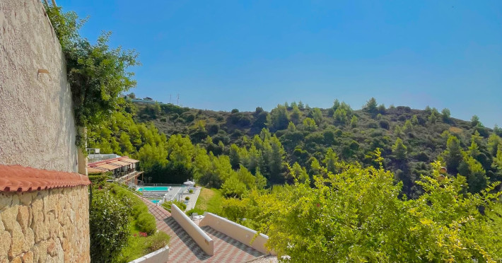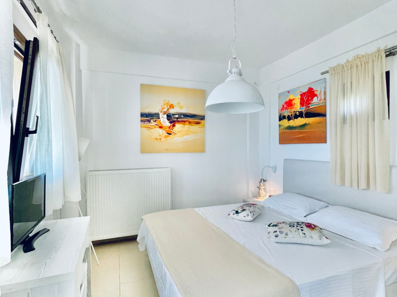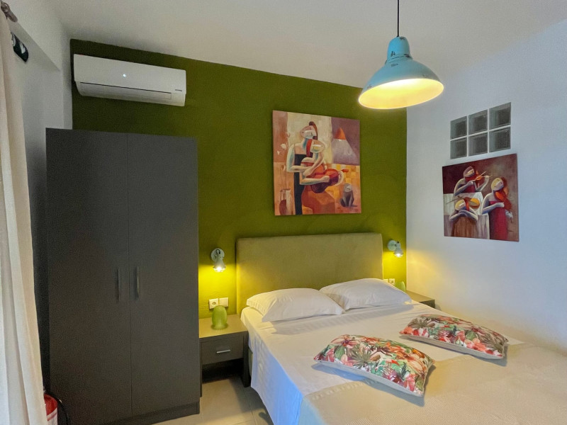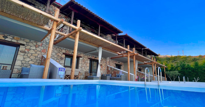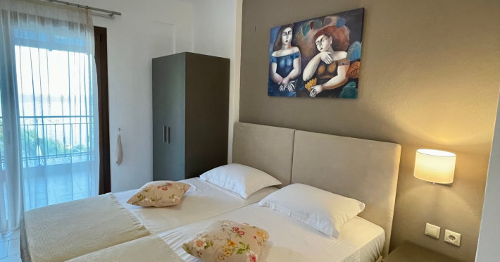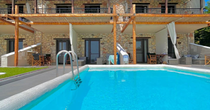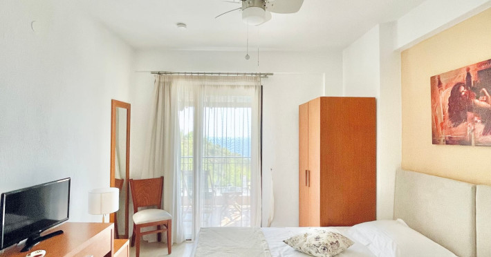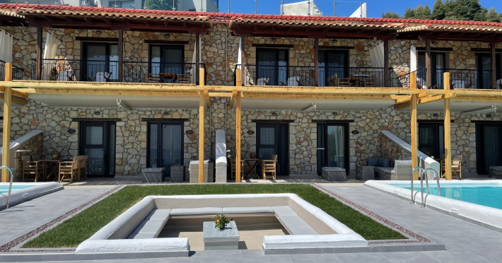The hotel is located on a hill in front and above the sea, offering its guests a unique view to the Aegean sea and to a unique sunset, it consists of 3 buildings built in an area of 3.500 square meters, offering fully furnished rooms/apartments of various sizes and types-studios or apartments and maisonettes with one, two or three bedrooms from 2 up to 7 persons ,quality full equipment, kitchen, a/c, tv in all rooms, free wi-fi, daily cleaning service, reception desk, up on request laundry-breakfast-all day dining menu, airport shuttle etc.. All rooms have a panoramic view to the sea,