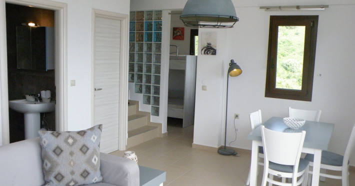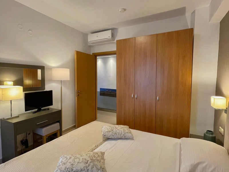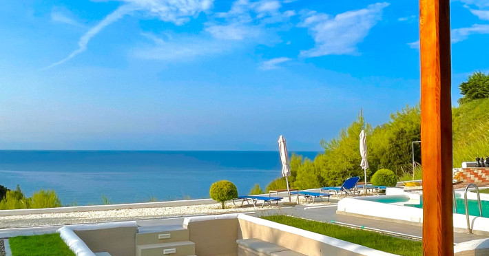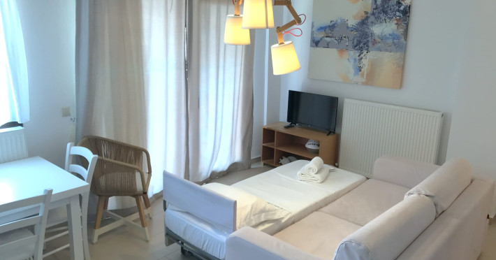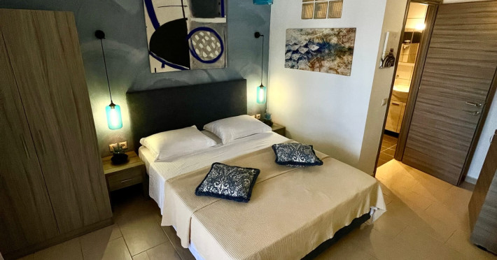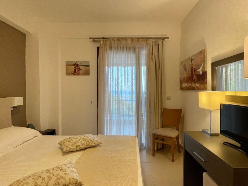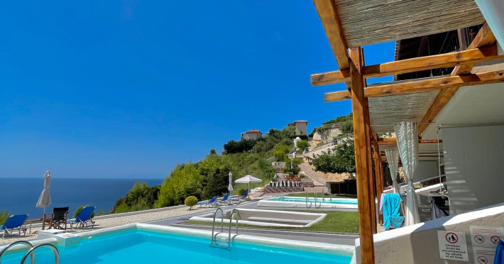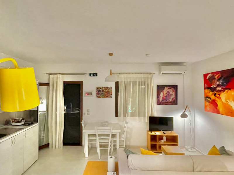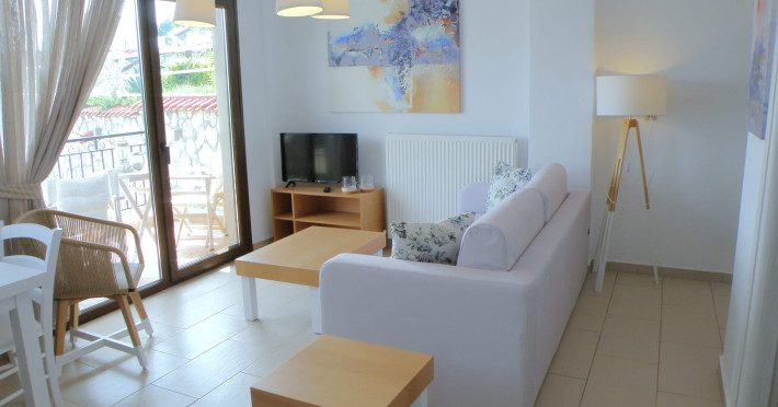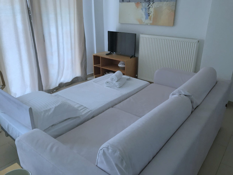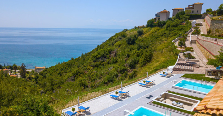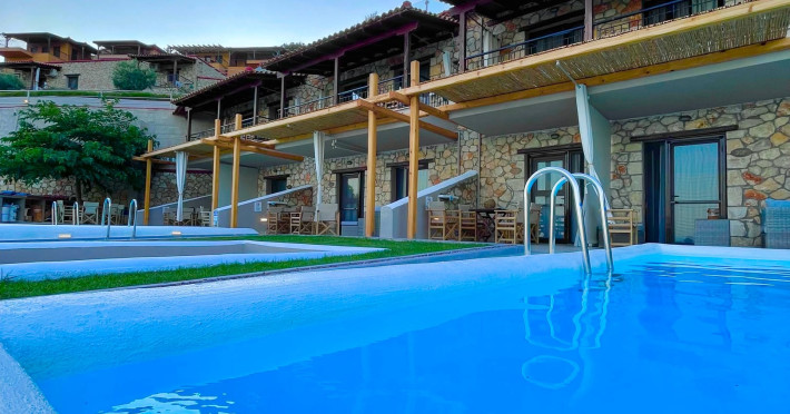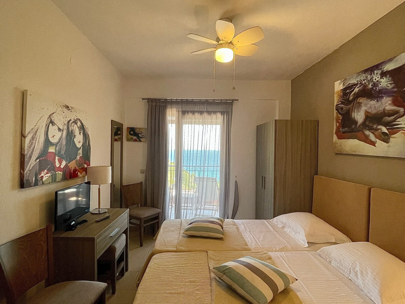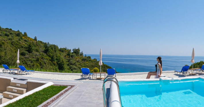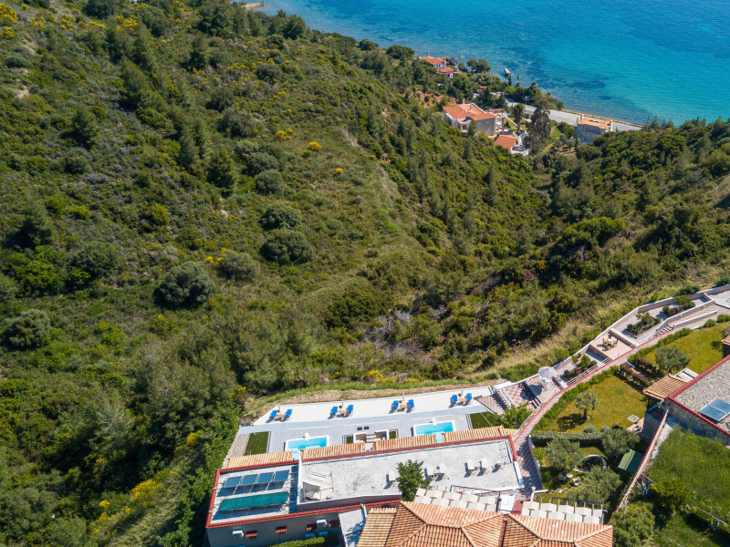 The hotel is located on a hill in front and above the sea, offering its guests a unique view to the Aegean sea and to a unique sunset, it consists of 3 buildings built in an area of 3.500 square meters, offering fully furnished rooms/apartments of various sizes and types-studios or apartments and maisonettes with one, two or three bedrooms from 2 up to 7 persons ,quality full equipment, kitchen, a/c, tv in all rooms, free wi-fi, daily cleaning service, reception desk, up on request laundry-breakfast-all day dining menu, airport shuttle etc.. All rooms have a panoramic view to the sea,