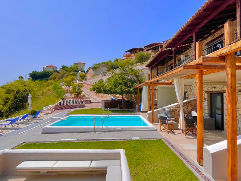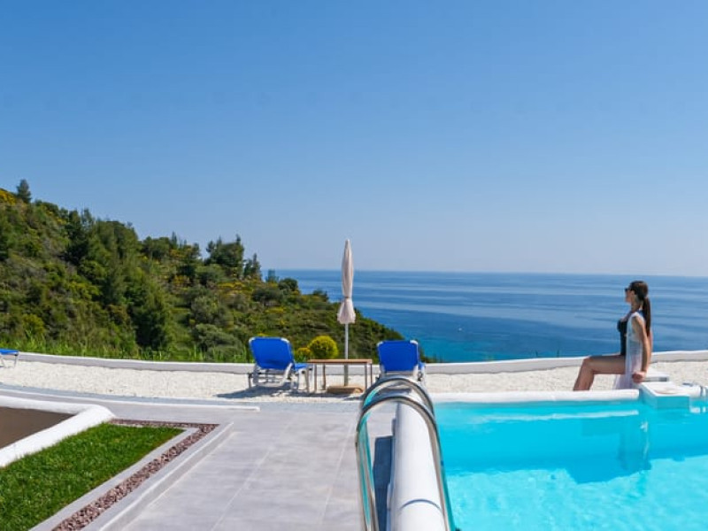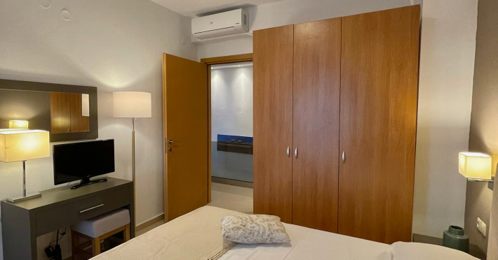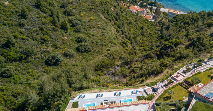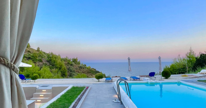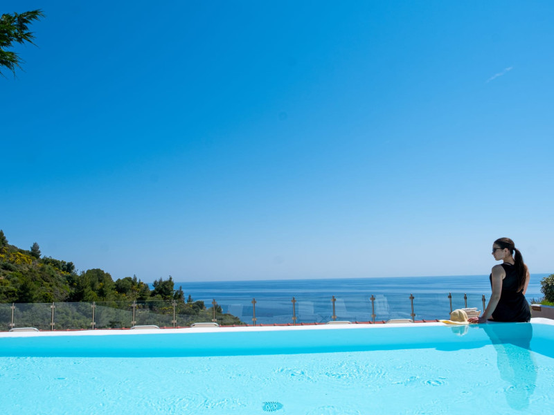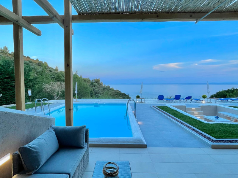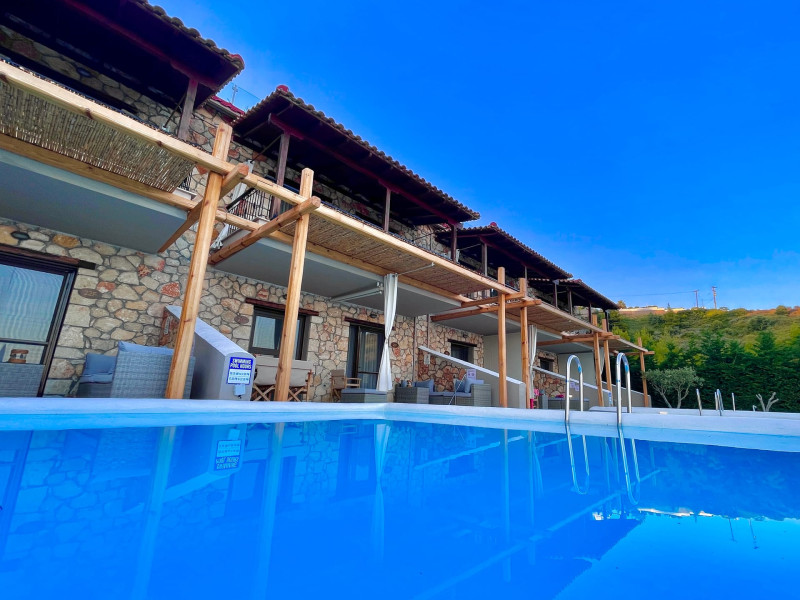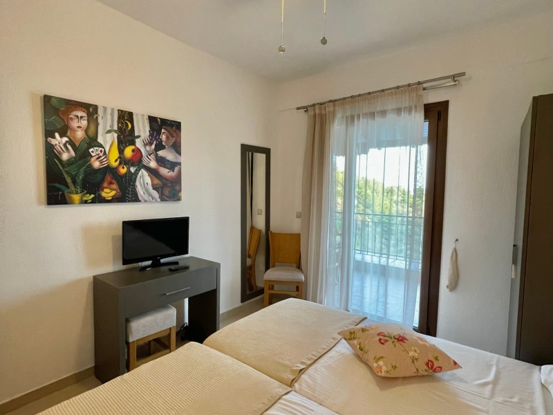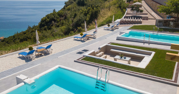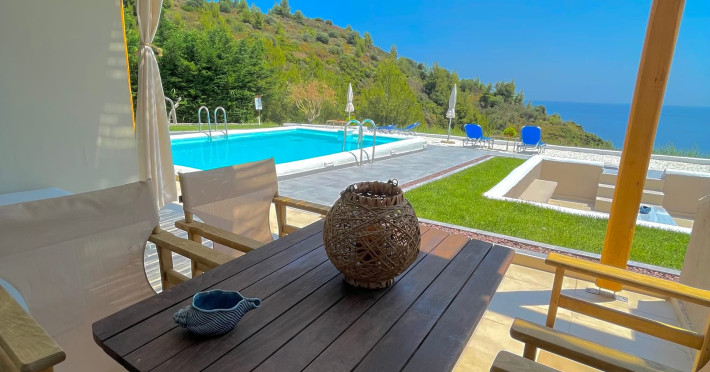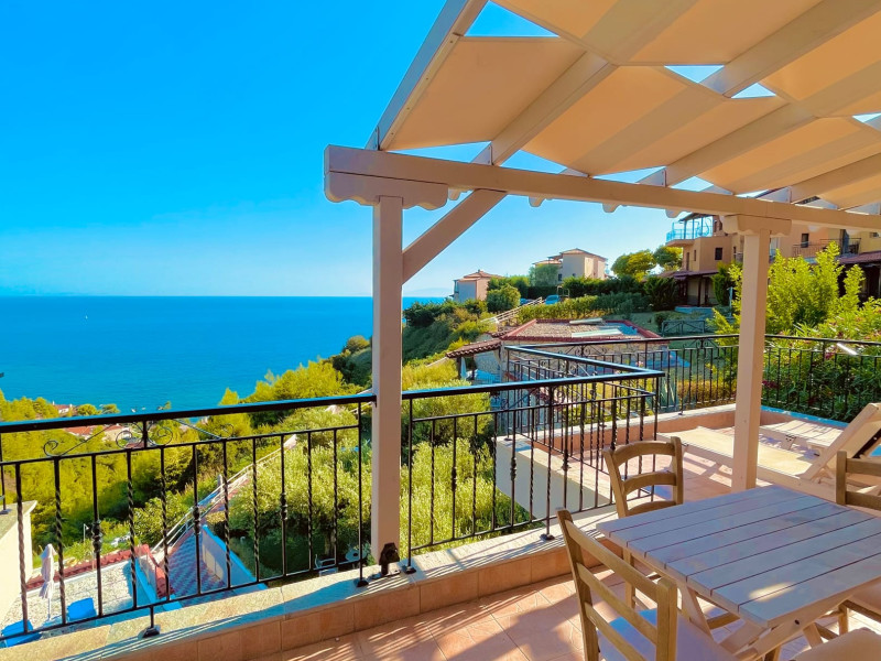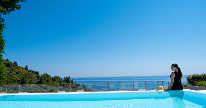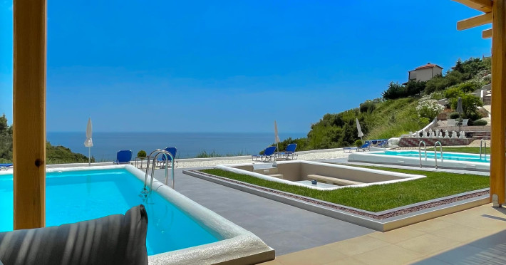 The hotel is located on a hill in front and above the sea, offering its guests a unique view to the Aegean sea and to a unique sunset, it consists of 3 buildings built in an area of 3.500 square meters, offering fully furnished rooms/apartments of various sizes and types-studios or apartments and maisonettes with one, two or three bedrooms from 2 up to 7 persons ,quality full equipment, kitchen, a/c, tv in all rooms, free wi-fi, daily cleaning service, reception desk, up on request laundry-breakfast-all day dining menu, airport shuttle etc.. All rooms have a panoramic view to the sea,