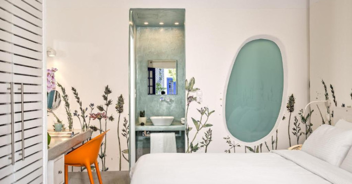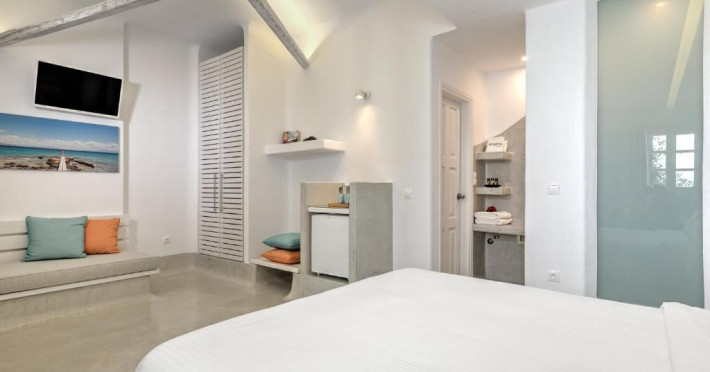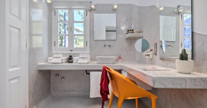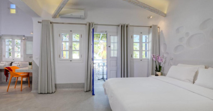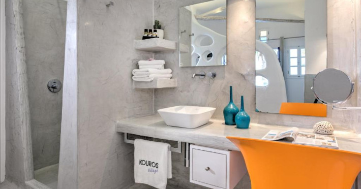 Camerele luminoase de la Kouros Village sunt dotate cu aer condiționat, Tv și seif. Fiecare cameră dispune de minibar. Oaspeții pot solicita serviciul de room service pentru a servi masa sau diverse băuturi. În camere există baie cu cadă sau duș, foehn, articole de toaletă gratuite, precum și halate de baie și papuci. Oaspeții au acces gratuit la serviciul Wi-fi în camere. Camerele au vedere la mare, la piscină sau la munte. Curățenia in cameră se face zilnic. Anumite camere au cadă cu hidromasaj care asigură un plus de confort și răsfăț. Proprietatea oferă camere pentru nefumători.