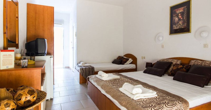 Sunt disponibile 36 camere. În camere există baie cu duș prevăzută cu foehn. Camerele au balcon cu masă și scaune unde pot fi petrecute momente de relaxare. Camerele de la Koviou Holiday Village au în dotare Tv cu canale prin satelit și seif. Oaspeții au acces gratuit la serviciul Wi-fi în camere. Fiecare unitate de cazare are frigider.