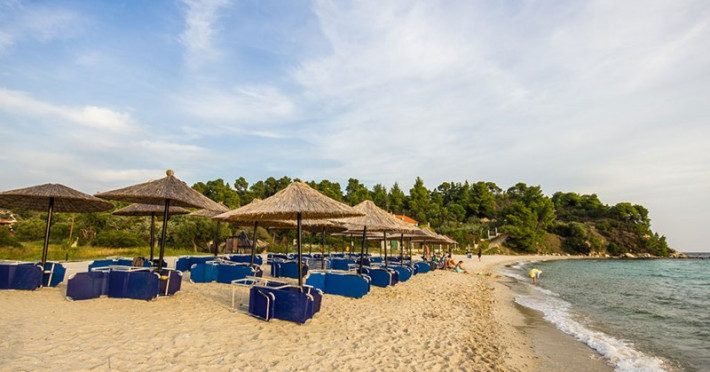 Koviou Holiday Village are în apropiere o plajă cu nisip/pietriș. Pe plajă există șezlonguri și umbrele de plajă.