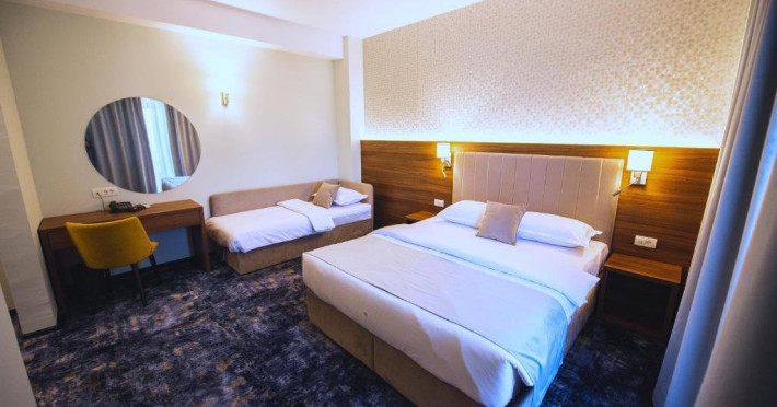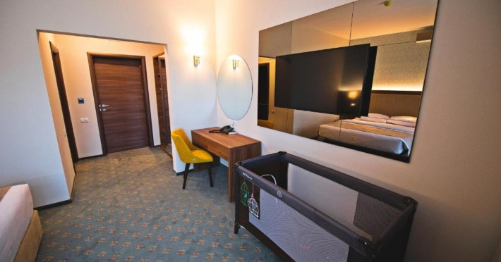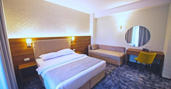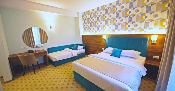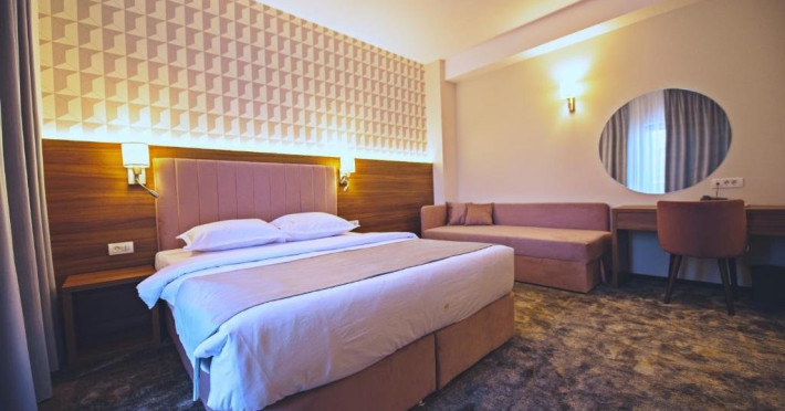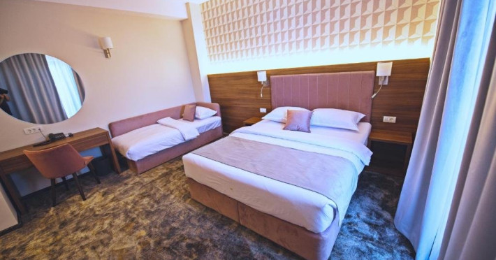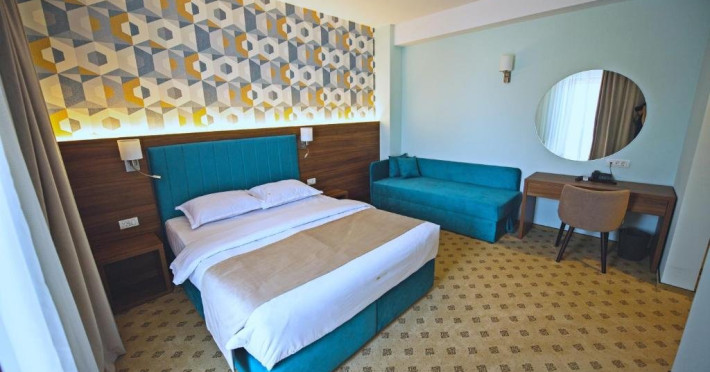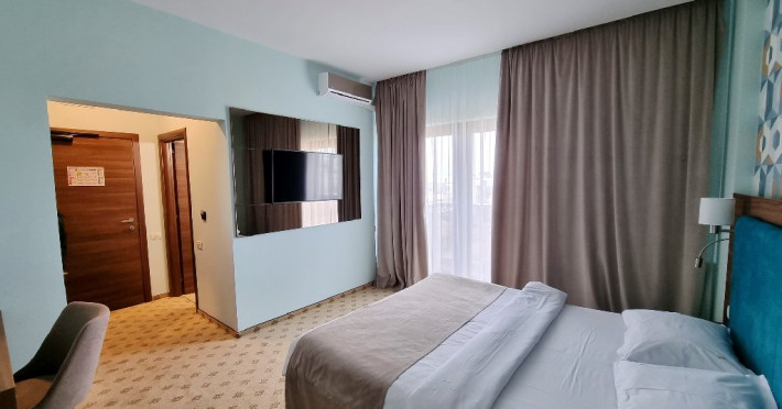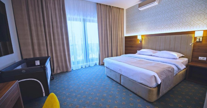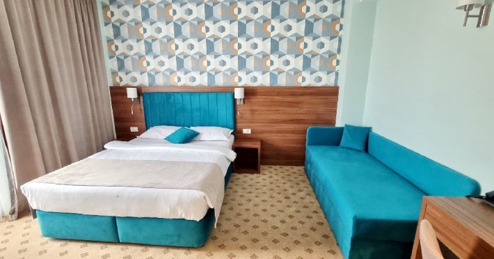 - camerele family - Aceste camere au fost create pentru a petrece vacanta la mare impreuna cu cei mici. Camerele sunt dotate cu un pat King size matrimonial si un pat suplimentar de 90x200 cm, capacitatea maxima a camerei fiind de: