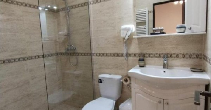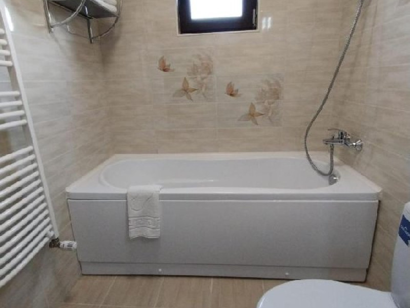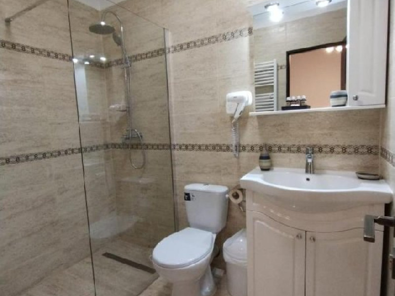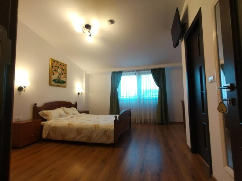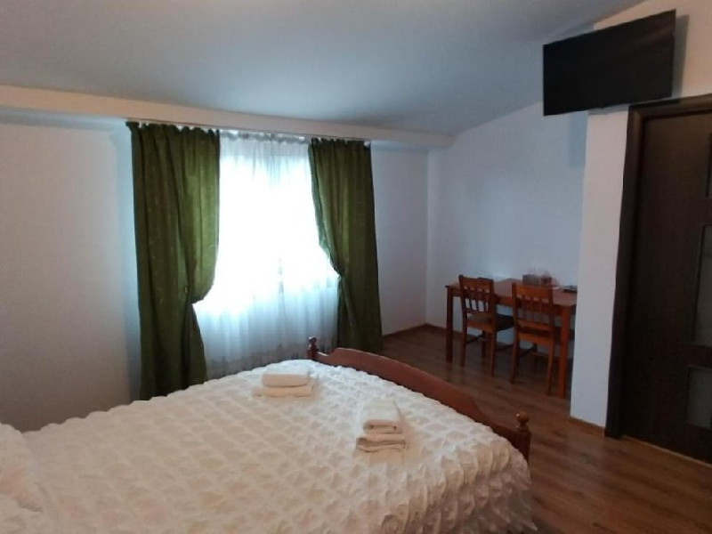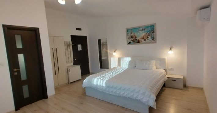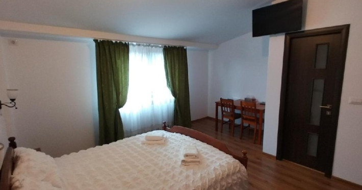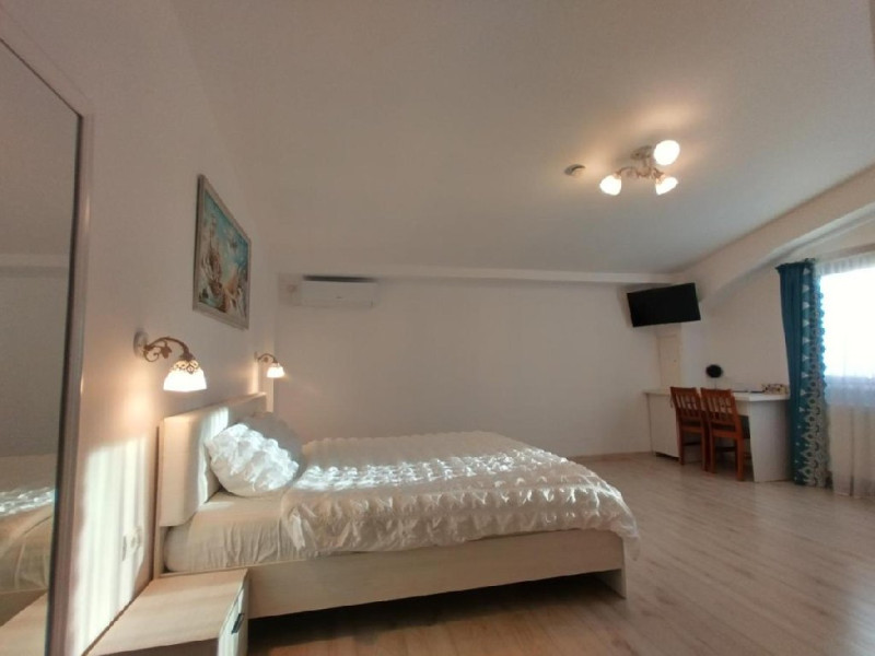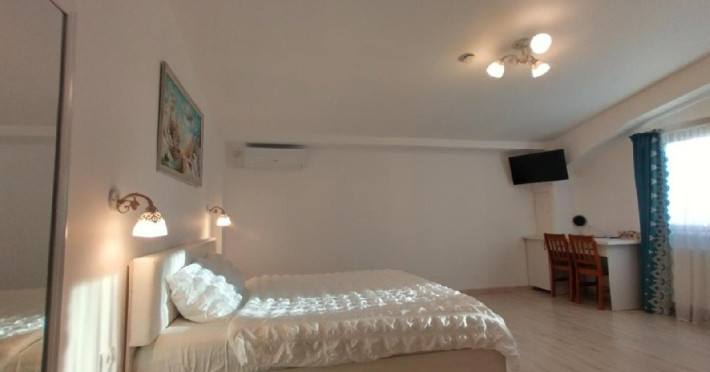 Camera dubla king deluxe, cu o suprafata de 21 mp, baie cu cada, uscator de par, minifrigider, TV, prosoape, AC, internet.