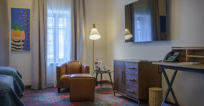 Camera twin standard (suprafata 14 - 16 mp) introduce turistii intr-un cadru boem prin interiorul distins si cald, prin nuantele elegante de albastru dar si prin designul reprezentativ. Pe langa cele doua paturi comode, oaspetii se vor bucura si de spatiu pentru relaxare.
