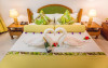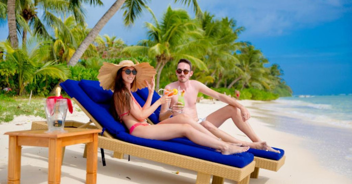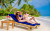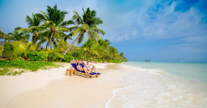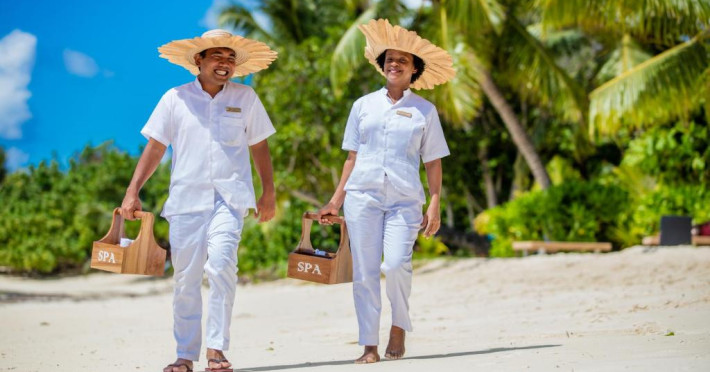 La Digue Island Lodge are acces imediat la o plajă cu nisip. Pe plajă există șezlonguri și umbrele de plajă.