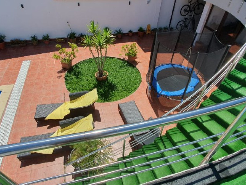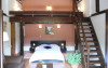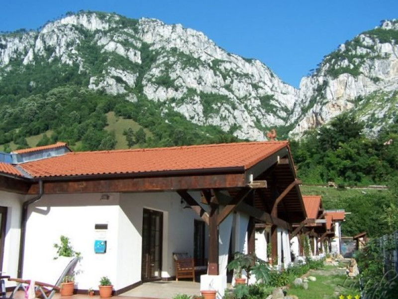 Pridvorul comun din fata camerelor este generos si cu deschidere spre gradina de flori. Tavanul camerelor este inclinat, cu grinzi de lemn aparente.