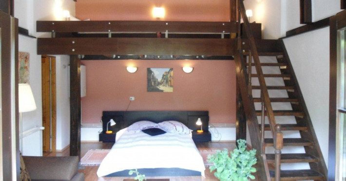 Camera de familie este o camera cu arhitectura speciala, cu o suprafata generoasa de 24 mp pe parter si cu o supanta la etaj de circa 10 mp. Legatura intre parter si supanta de la etaj se face printr-o scara interioara din lemn. Pridvorul comun din fata camerelor, mobilat cu mobilier de gradina, este generos si cu deschidere spre gradina de flori a pensiunii. In camera de la parter este dispus un pat matrimonial extra large (180x200xm) cu noptiere, o canapea extensibila (140x200cm), masuta cafea, fotoliu extensibil. Dulapul pntru haine este amplasat in holul de legatura cu grupul sanitar.