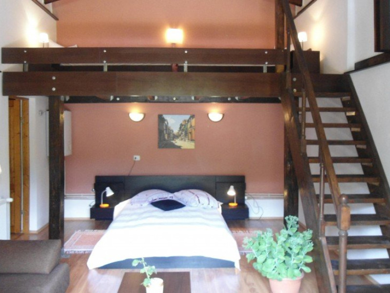 Apartametul este format dintr-o camera de zi cu scara interioara si supanta, un dormitor, hol si o baie. Camera de zi are o arhitectura speciala si o suprafata generoasa de circa 24 mp pe parter si cu o supanta la etaj de circa 10 mp. Tavanul livingului si al dormitorului este inclinat, cu grinzi de lemn aparente.